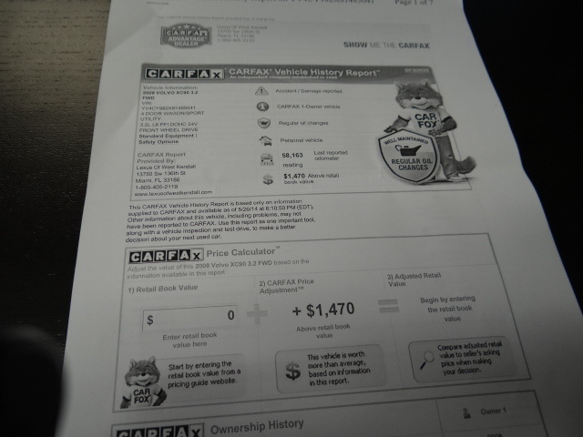 YOU ARE VIEWING A NICE 2008 VOLVO XC90 3.2L INLINE 6 CYLINDER!! ONE OWNER! FLORIDA OWNED AND RUST FREE! LOW 71K ACTUAL MILES! NO RESERVE AUCTION! LOADED UP WITH EXTRAS! BLIND SPOT DETECTION, MOONROOF, DUAL A/C, THIRD SEATS, WOODEN STEERING WHEEL, LEATHER SEATS, PREMIUM AUDIO, CD PLAYER, MEMORY POWERED SEATS AND MUCH MUCH MORE! PERFECT COLOR COMBINATION! VERY WELL DEALER SERVICED!! DRIVES LIKE NEW! EVERYTHING WORKS! CARFAX CERTIFIED! SHOWS A MINOR INCIDENT WHERE THE VEHICLE WAS SWIPED IN THE FRONT WHICH COUSED ONLY SOME MINOR SCRATCHES IN THE FRONT BUMPER. IT HAS BEEN TOUCHED UP AND HARD TO NOTICE. THE LAST PICTURE SHOWS WHATS ON THE REPORT. OPEN TO INSPECTIONS! VEHICLE SEEMS TO HAVE NO PAINT WORK! DONT MISS OUT ON THIS RARE FIND! 7 DAYS NO RESERVE AND THE HIGHEST BIDDER WILL OWN THIS BEAUTY! ABSOLUTE SALE! IF YOU HAVE ANY QUESTIONS PLEASE CONTACT US AT 305-345-8318 OR 305-200-9433 FOR GREAT SHIPPING DEALS JUST CALL OR EMAIL ZIP CODE! FREE AIRPORT PICK UP!