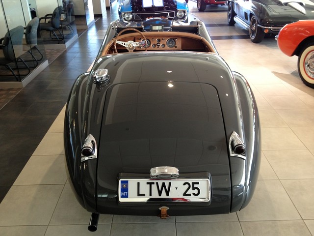 This XK120 Roadster is only the 25th left-hand-drive example built by Jaguar; early cars like this one were hand-built with aluminum bodies on ash wood frames. And many of them were raced out of the box, as may have been the case for this example. In 1950 Jaguar switched to mass-production using pressed-steel bodies. Early XK120s posted top speeds over 120 mph in magazine testing, and a specially prepared example reached almost 137 mph, making it the world's fastest production car. 670025 was imported through legendary importer Max Hoffman, who was the Jaguar distributor in this country.