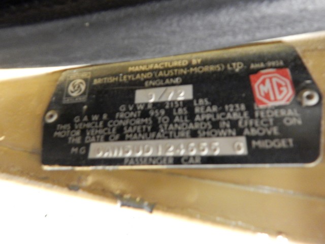 “One of a kind!” This 1973 MG Midget has a great deal of documentation to cover all three owners .  Every single thing that has EVER been done to this car has been documented in a journal. Right down to the oil changes. 2 seat convertible has only 35,671 documented miles. 1275 cc. 4 Cylinder gas engine  4 Speed manual transmission. New convertible top with parade boot. Rack and pinion steering. Front disc brakes. Rear drum brakes. 145R13 Tire size. Curb weight 1701 lbs. Ground clearance 5”.  Warranty available upon request, up to two years of coverage! So much character in a tiny automobile, down to the three wiper blades. Zip around town in this economical piece of British history.