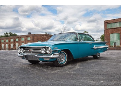This 1960 Chevrolet Impala has a 348 C.I. Tri-Power V8 (Date Code Correct), Powerglide Automatic Transmission, 3.55 Rear End Ratio, Correct Tasco Turquoise Paint w/ White Coves, Correct Turquoise Interior, 14” Steel Wheels w/ Period Correct Hub Caps, Radial Tires w/ White Walls, AM Radio, Power Steering, Power Brakes, 348 Badging, Rechromed Bumpers, Fender Skirts, Full Size Spare & Jack, Dual Exhaust w/ Chrome Tips, Wipers w/ Washers, New Carpet & Upholstery, Arguably One of the Best Years for the Impala! Long, Sleek & Beautiful Tri-Power 348 Impala!!