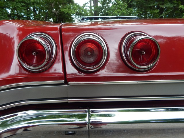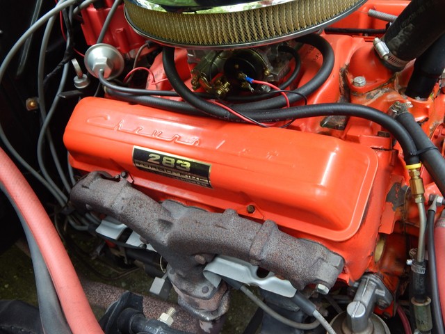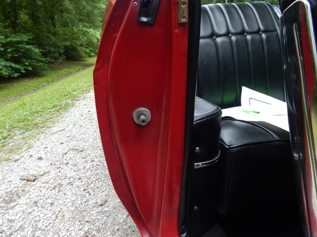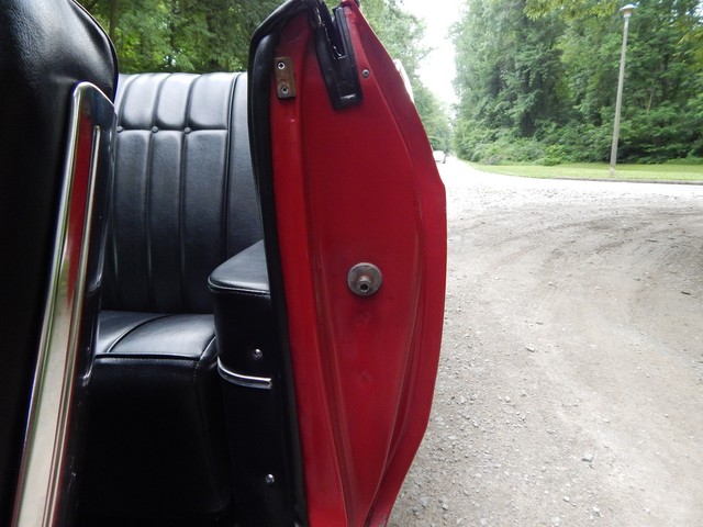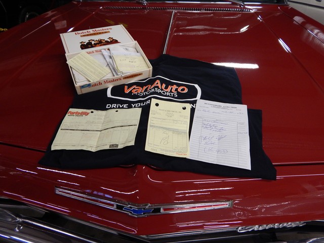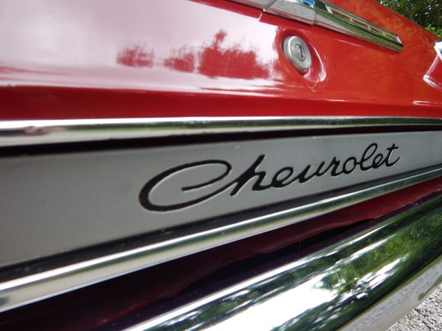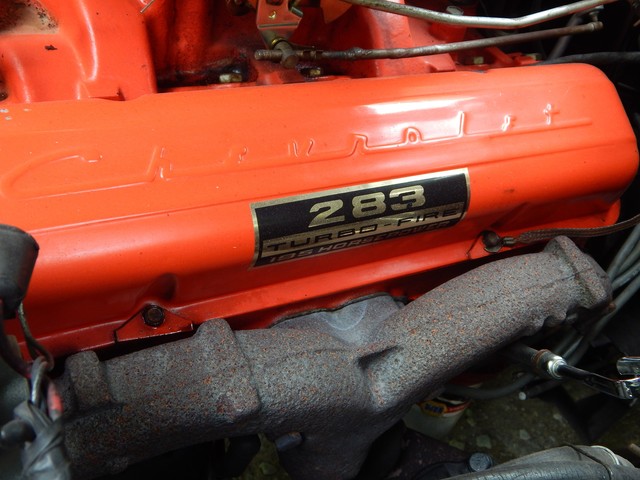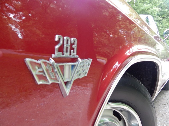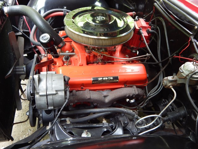 A favorite at the dealership and real head turner! 283cu. in. V8 engine. Smooth 283 engine was overhauled during  the restoration process.  Automatic Transmission. Raised white letter Remington tires. Dual exhaust. AM/FM/Cassette. Beautiful white power top. Black leather interior.  Owned and loved for 35 years previously. Top to bottom restoration with detail in mind. There are some waves in the body work, but the interior more than makes up for it. There is a tiny crack between the convertible top and the trunk lid, which can be seen in the picture. This is likely from the 10 year-old restoration. We also have a cigar box filled with the receipts and documentation of the work. Never been smoked in.