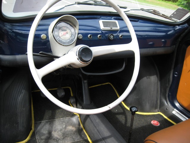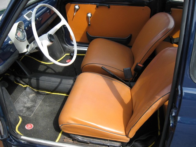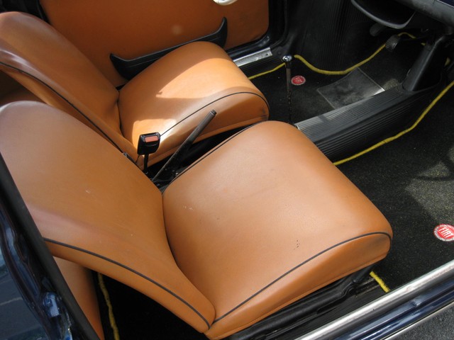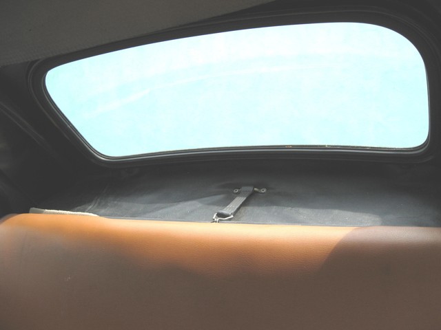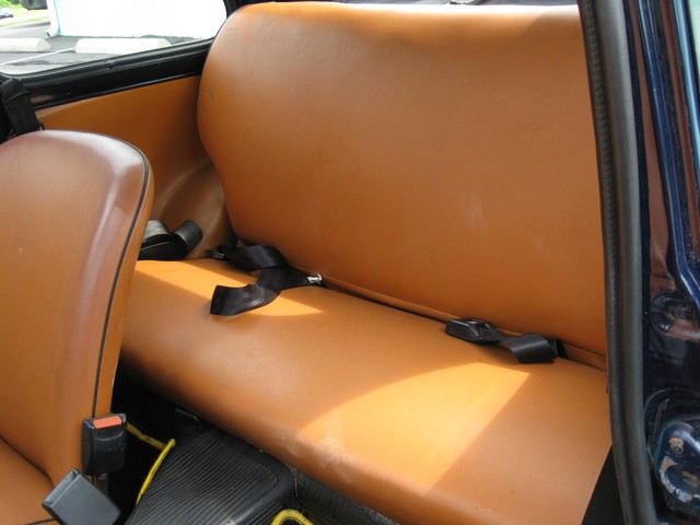 There is more room inside this little car than expected. The front seats have a lot of travel fore & aft and your 6' 4" dealer can fit in & drive comfortably. The interior is in good condition with no rips or split seams in the seats. There are storage cubbies in the door panels and under the dash. The rear seat-back folds down for extra storage. There are three point seat belts for the front seats and lap belts in the rear.