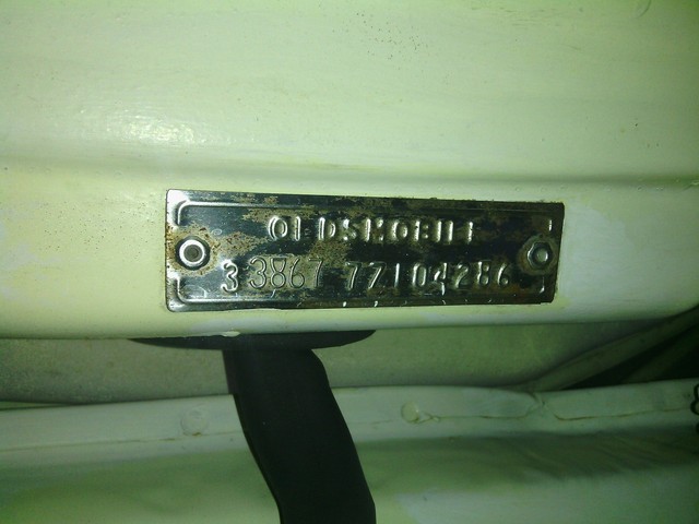 The VIN is broken down into: 3- Oldsmobile, 38- Cutlass Supreme, 67- 2 door convertible, 7- model year 1967, Z- Fremont, California assembly plant, and 104286- production number. The cowl tag reads: 11A- 1st week of November for production date, 67-33867—Cutlass Supreme Convertible, BF 00150- Fremont, California 00150 serial number, TR 978 – Yellow vinyl interior with bucket seats, and Paint- Y8 - Saffron Yellow.