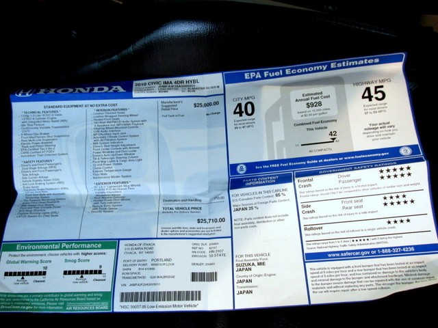 You are looking at a beautiful *1-OWNER* 2010 Honda Civic Hybrid with LEATHER INTERIOR & HEATED SEATS. It has only 72K original highway miles. It is still under *HONDA FACTORY WARRANTY* in emission compliant states for hybrid system including hybrid battery. The warranty is 10years/150k miles in NY, CA, ME, NH, NJ, VT, CT etc. 8yrs/100k in all other states. Factory warranty automatically transfers to the new owner. CLEAN TITLE & HISTORY NO LIEN. Car runs great without any issues & could be confidently driven anywhere. All lights on the dash work fine and none of the service indicator light is on. A/C blow cold air.  Great fuel ecomony 40/45 City/Highway better than any four door sedan of this size in the market. All electrical equipment on this vehicle works fine, all power windows slide up and down without any problem. Breaks are good and bring the car to a complete and quick stop. Exterior of this Honda is very condition and has all shinny paint. There are hard to find couple or dings and few scrapes normal to use of the vehicle. Interior of this prius is in good shape, you may find some wear signs.  Please see  all pictures and read notes for evaluation of exterior and interior cosmetics. This Honda is mechanically strong and could be confidently driven across country today.