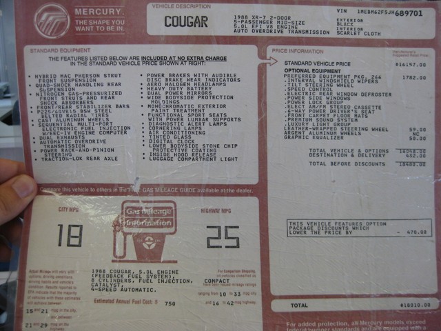 You are looking at neat piece of automotive history.  You are bidding on a 1988 Mercury Cougar XR-7 2DR.  It currently has 17142 original miles and yes it looks it!  Very clean inside out this car has not been in the weather but came from a well maintained home.  Sold here at Ashe County Ford, Inc NEW, this ride has history and power connected to it.  It is equipped with the 5.0 V8 and an Auto Overdrive Transmission.  Just to list some of the standard equipment, it has dual exhaust, cast aluminum wheels, power steering, traction lock rear axle, power brakes, wide body moldings, and much more.  Now for the factory optional equipment.  This Cougar has interval wipers, tilt steering, speed control, electric rear defrost, power windows, power locks, 6 way power seat, front floor mats, premium audio package, and luxury light group which gives you leather wrapped steering wheel, argent aluminum wheels, graphic equalizer.  Car has original sticker lamenated and on the dash for easy reading.  This car is as clean as they come so bid with confidence.  For any questions call TIM HAMM at 336-877-0737 direct on his cell.