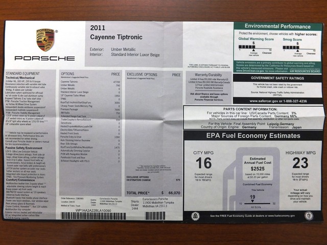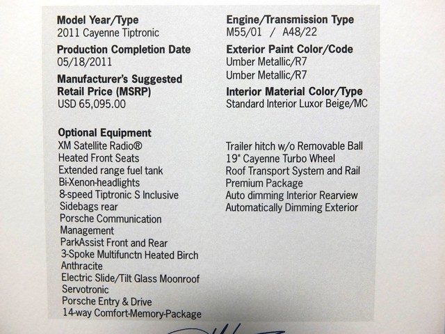 OUR PORSCHE CAYENNE IS VERY WELL EQUIPPED!  IT HAS NAVIGATION, PREMIUM AM/FM/CD/DVD/BLUETOOTH AUDIO SYSTEM, HEATED LEATHER SEATS, DUAL POWER SEATS, SUNROOF, POWER LIFTGATE, PARKTRONIC FRONT/REAR, ROOF RACK SYSTEM, KEYLESS ENTRY & START, 19" ALLOY WHEELS, DEEP TINTED WINDOWS, AND SO MUCH MORE!  VIEW THE "FEATURES & OPTIONS" SECTION BELOW THIS DESCRIPTION FOR MORE DETAILS ON ALL THIS SUV HAS TO OFFER!  (YOU CAN ALSO SEE THE ORIGINAL WINDOW STICKER IN THE PICTURES BELOW.)