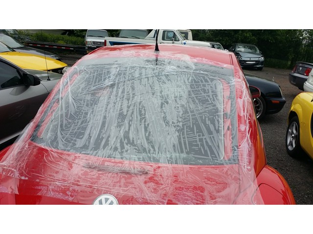As seen in the pictures down below this nice looking 2004 VW Beetle Turbo Sport 6-Speed Manual has sustained light body dents. This vehicle was directly purchased from insurance auctions for resale in the condition you see it on the pics. No middle man involved. We have the salvage certificate of title (no-liens) at hand and ready to transfer to the new owner. Such vehicles can be legally returned back to the roads after repairs and your state motor vehicles inspection. Damaged areas are clearly shown in the pictures below. This is not a roll over vehicle. Looks like some thing(s) fell mainly on the roof of this vehicle. Roof has light fixable dents as seen in the photos. Hood and rear hatch door also has very light dents. All the dents on the vehicle are easily fixable. Other body panels are good. The rear hatch door glass along with the sunroof glass are broken (currently covered with plastic collision cover). Driver side mirror and one taillight is broken. The rest of the exterior is in great condition with great looking paint. No damage to the interior but front seats have stains and rips. The great news is that the car starts, engine runs great, goes into gear and we are able to drive it around within our lot. All airbags are good. No suspension damage observed. This is the Turbo Sport version of the regular Beetle. Comes equipped with 1.8L Turbo engine, very rare 6 Speed Manual transmission, Dual Tone interior, Sport front and rear bumpers, Extra large Sport Alloys with good looking tires. Overall, it should be a fairly easy fixer with minimal parts and light body work. No major body parts needs to be changed and the body dents can easily be fixed at a body shop. Please see many pictures posted down below for overall condition of the vehicle and feel free to ask any questions you might have. Note: White shadows seen on the body panels are the clouds in the sky and most body panels are good with nice paint.