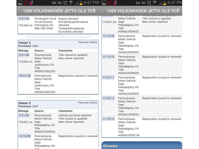 We often use these services to check a vehicles background.  Carfax and Autocheck are wonderful services,  but they have their limitations.  Many times they will show more “owners” than we may state a vehicle has had.  This is because they are an information service only.  They have never seen the car, owned the car,  and have no other information about the car than what is reported from different agencies.  All of this information is originally hand entered into their databases at their source and mistakes and inconsistencies will occur !  For example when a dealer such as ourselves purchases a vehicle they may pick it up as a new owner when this is of course not the case as dealers are not end users.  Also they often contain mileage errors and inconsistencies that appear to make little sense.  Just like any computer generated information report you need to know how to read the report & when to read between the lines. Having seen thousands of these over the years we can help you understand the information listed in these reports,  just ask.