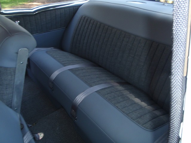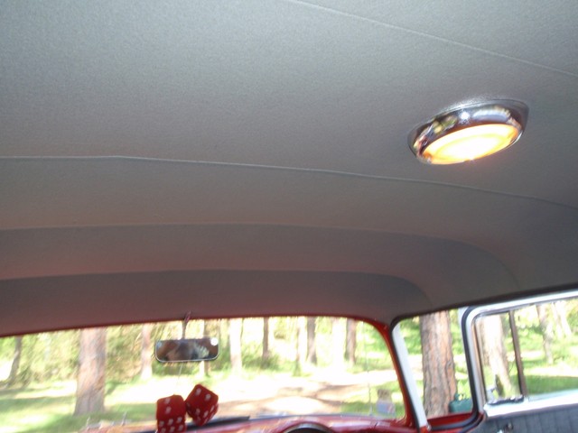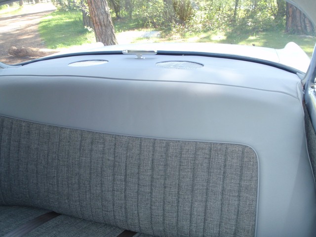 grey headliner-package tray and carpet. Seat belts front and rear.
