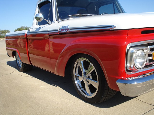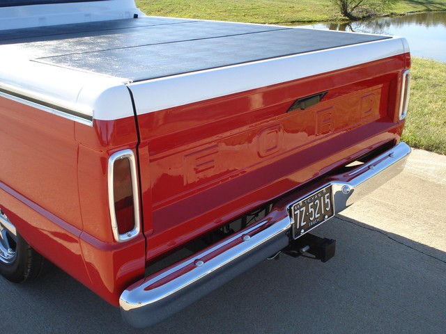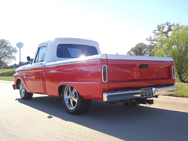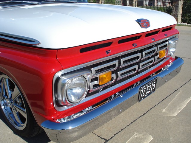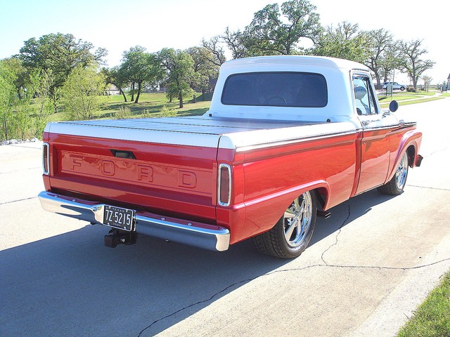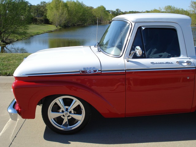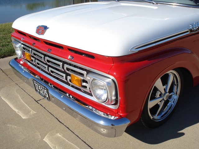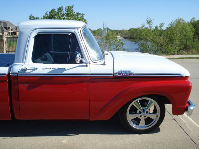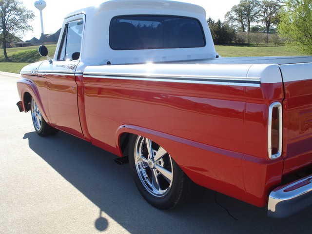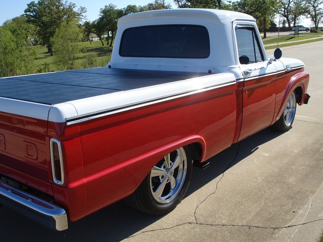 NO RESERVE; 94 Pictures below.  1964 Ford F100 Custom Cab Short Bed; Pro-Shop Built Custom Truck.  Pro-Touring; Frame off Build.  This Custom Red and White 64 Custom Cab truck was a complete nut and bolt frame-off build.  This truck was built to have the ability to drive across country, tow a small trailer if needed and enjoy the comforts of some modern technology. With a Custom Built Ford performance 460 V8 engine a C6 Automatic Transmission upgraded Shifter, hurst handle and with a Trick-Flow pan and dip-stick conversion, a Ford 9" Posi-Trac Rear End and 2:89 gears.  The tires will rip until you let off the gas and the truck shifts and cruises great on the hwy.  The build includes all new wiring, electronic ignition, upgraded electric cooling, aluminum radiator with a transmission cooler, a serpintine belt system, custom exhaust with side tips and CPP 4-Wheel Power Disc Brakes.  The Front Suspension System is a Custom 4" Lowered Boxed Heidts C2 Style with coils and tubular upper and lower arms with power rack and pinon steering.  The rear is custom tubbed and lowered 6" fitting the 295/45 ZR18 Tires and Custom Cragar Wheels.  The Fuel system incudes power fuel pump and a 20 gallon Stainless Fuel cell under the bed with a hidden filler in the bed.  The bed has a custom built cover that opens from either end and covers a tool box in the front.  Interior cabin is an all custom with Ford Truck SVT black and grey sued and leather seats with a custom matching black and grey headliner and center console.  Interior has Vintage Heat and Air Conditioning, a Flamming River Tilt Steering Column, Shelby inspired SW Gauges and JVC Audio.  Truck has a tow hitch with 3rd brake light.  Engine bay includes a Red Top Optima Battery, Aluminum Radiator Overflow bottle, Chrome Altinator, K&N Air Filter, MT Valve Covers, Edelbrock Intake with a Holley Carburator with Modern Wiring and Fuses.  She has 3492 proven miles on her since the build.  I have driven this truck personaly at low and hwy speeds.  Call me (Ron) at 682-333-7433 with any questions.  check out the 94 pictures posted below.