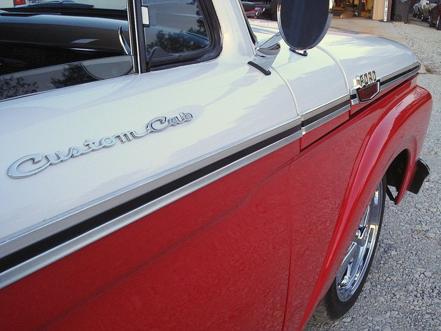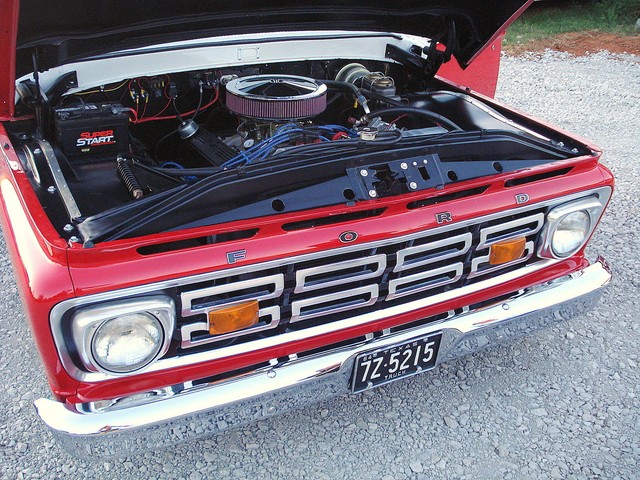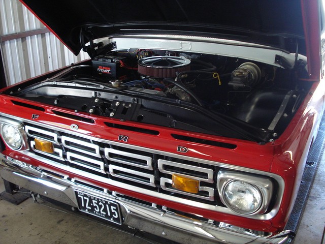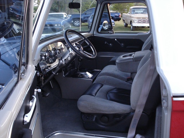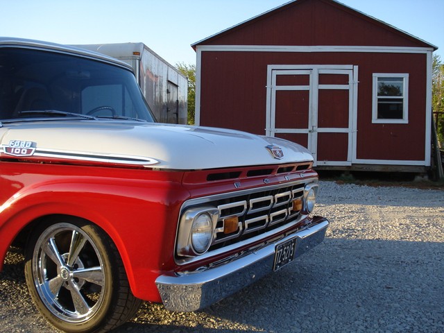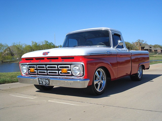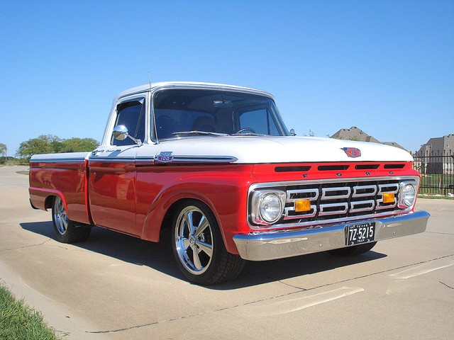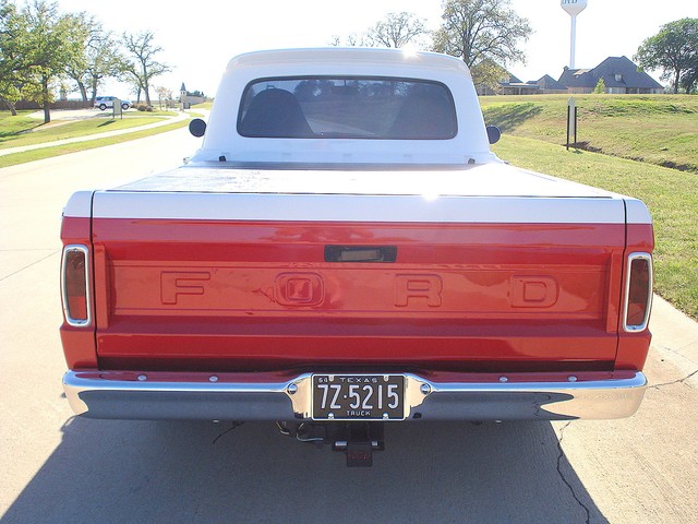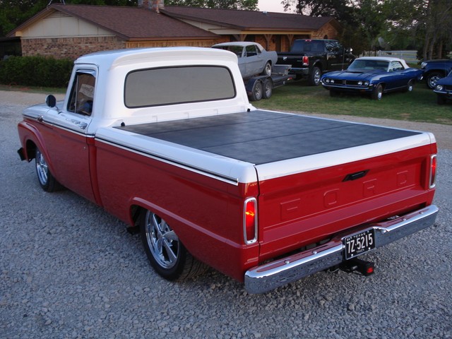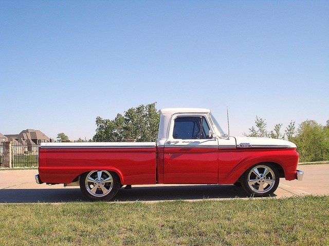 NO RESERVE; 94 Pictures below.  1964 Ford F100 Custom Cab Short Bed; Pro-Shop Built Custom Truck.  Pro-Touring; Frame off Build.  This Custom Red and White 64 Custom Cab truck was a complete nut and bolt frame-off build.  This truck was built to have the ability to drive across country, tow a small trailer if needed and enjoy the comforts of some modern technology. With a Custom Built Ford performance 460 V8 engine a C6 Automatic Transmission upgraded Shifter, hurst handle and with a Trick-Flow pan and dip-stick conversion, a Ford 9" Posi-Trac Rear End and 2:89 gears.  The tires will rip until you let off the gas and the truck shifts and cruises great on the hwy.  The build includes all new wiring, electronic ignition, upgraded electric cooling, aluminum radiator with a transmission cooler, a serpintine belt system, custom exhaust with side tips and CPP 4-Wheel Power Disc Brakes.  The Front Suspension System is a Custom 4" Lowered Boxed Heidts C2 Style with coils and tubular upper and lower arms with power rack and pinon steering.  The rear is custom tubbed and lowered 6" fitting the 295/45 ZR18 Tires and Custom Cragar Wheels.  The Fuel system incudes power fuel pump and a 20 gallon Stainless Fuel cell under the bed with a hidden filler in the bed.  The bed has a custom built cover that opens from either end and covers a tool box in the front.  Interior cabin is an all custom with Ford Truck SVT black and grey sued and leather seats with a custom matching black and grey headliner and center console.  Interior has Vintage Heat and Air Conditioning, a Flamming River Tilt Steering Column, Shelby inspired SW Gauges and JVC Audio.  Truck has a tow hitch with 3rd brake light.  Engine bay includes a Red Top Optima Battery, Aluminum Radiator Overflow bottle, Chrome Altinator, K&N Air Filter, MT Valve Covers, Edelbrock Intake with a Holley Carburator with Modern Wiring and Fuses.  She has 3492 proven miles on her since the build.  I have driven this truck personaly at low and hwy speeds.  Call me (Ron) at 682-333-7433 with any questions.  check out the 94 pictures posted below.