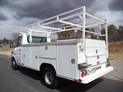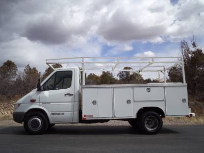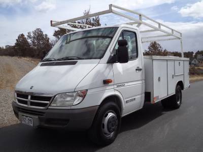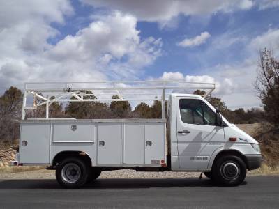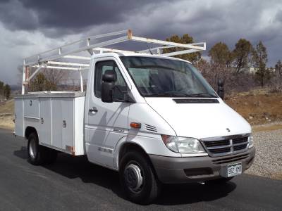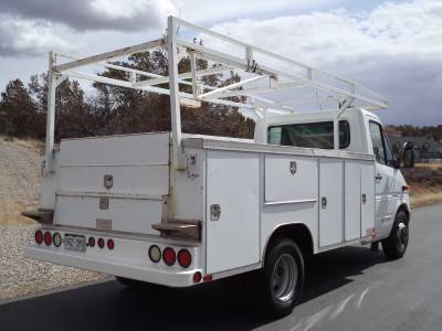 This Dodge (Mercedes) Sprinter utility truck is in great condition, it starts, runs, drives and stops excellent in every way. Equipped with a powerful Mercedes turbo diesel engine, automatic transmission, a power package which includes, power windows-locks, power seats, cloth, AC, CD, cruise control, easy to clean vinyl floors and more. We just installed a brand new factory windshield, tires are approx. 50%, has a full lumber rack, a heavy duty $10K utility bed with tons of storage all lockable and wired with an alarm system so no one will be walking off with your tools. I will have this truck professionally steam cleaned and detailed inside before it leaves the lot. This is a local one owner truck, has never been in an accident, is non smoking, adult owned, has never been abused in any way. This is a very tight truck, is ready to go to work, it will not disappoint you.
