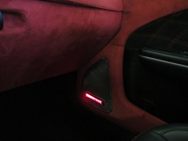 • Custom shaped front seats with black leather, black suede, and red accent stitch