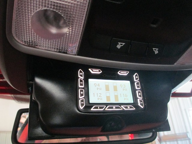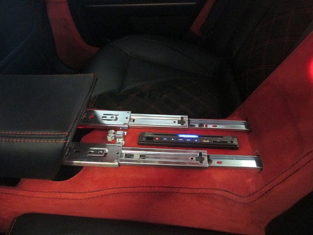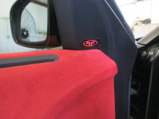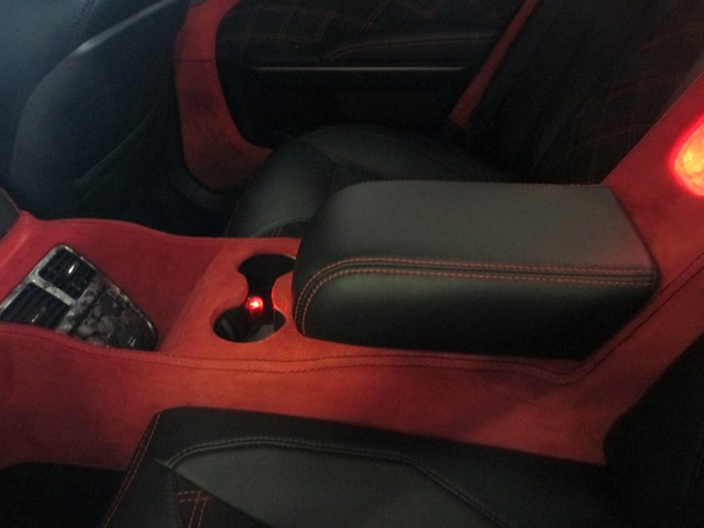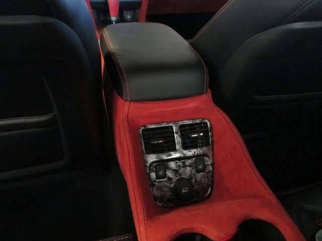 • Custom rear bucket seats with black leather, black suede, and red accent stitch