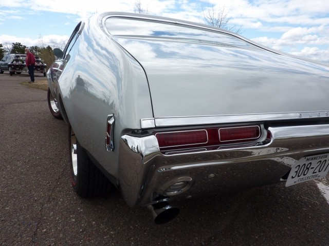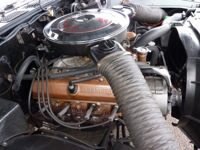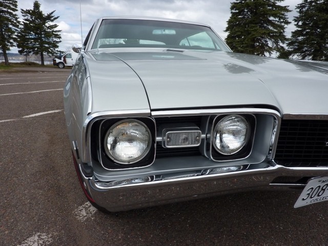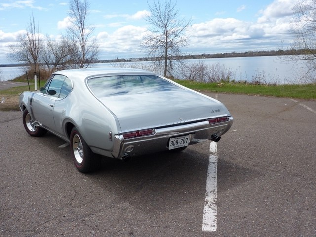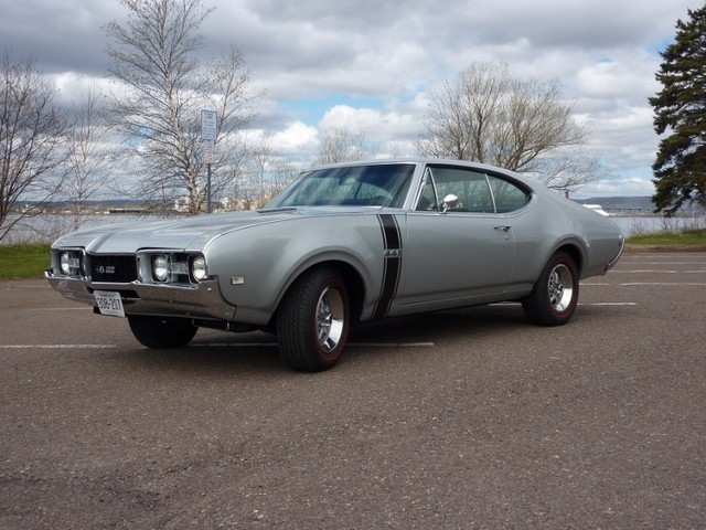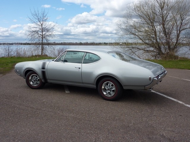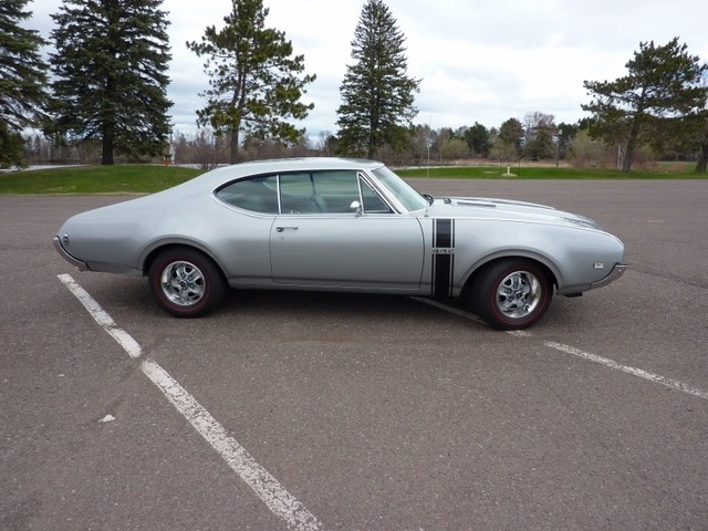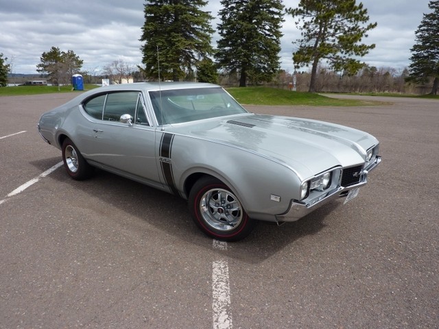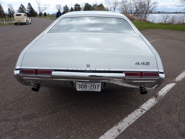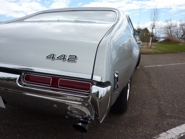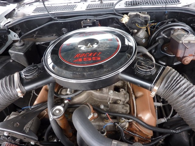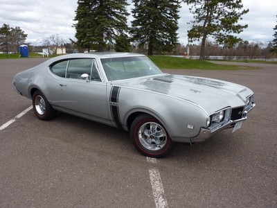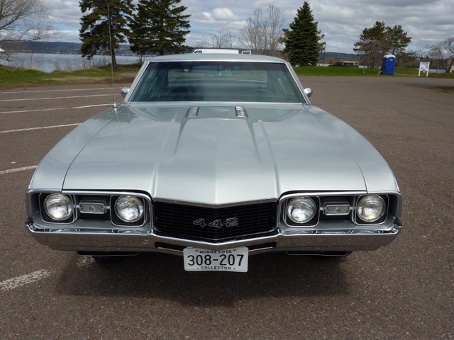 This 442 is beautifully finished in Silver Cortez paint and black vinyl interior.  It is powered by a 455 NOM with 30 over 465 and a mild cam putting out approximately 360 hp.  The motor is from a 1968 Toronado and has 4000 miles on it since the rebuild and has a Turbo 400.  It has a 4BBL with automatic transmission, MagnaFlow dual exhaust, and 3:91 posi. The interior of this car is showroom clean.  Options include power steering, power brakes, clock, smoked glass, original AM/FM radio, Sunpro Tach and Sunpro Gauges.  The engine bay and undercarriage are immaculate.  No corners were cut on the restoration which was done in 2008.  This 442 is straight as an arrow and has a healthy rumble.
