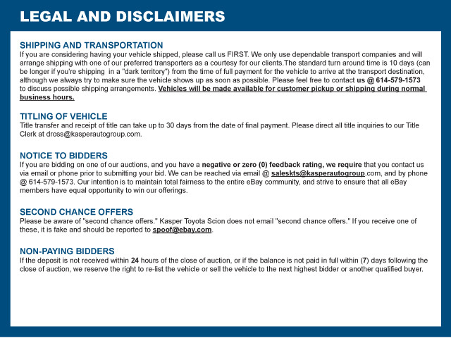 If you have any questions at all, just give me a call. I would be happy to do a visual walk around inspection and test drive with you on the phone or over Skype. Most of our vehicles sell before the auction ends so call or text me direct at (614) 579-1573. Let me show you how easy the buying process is here at Kasper!
