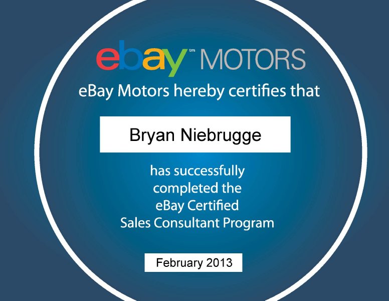 The last 4 years have been a huge increase for us due to BRYAN NIEBRUGGE accepting the eBay Manager position. Bryan has been recognized as the Number 1 sales professional for the entire company. Bryan has dedicated his time to providing the BEST INTERNET BUYING EXPERIENCE out there, by providing door to door shipping, great finance options, best pricing and a complete no pressure - no hassle experience.