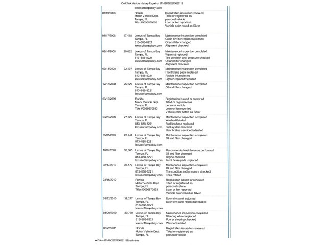 With only one previous Florida owner, this automobile is ready for you. The mileage represented on this vehicle is accurate.There is no previous collision damage to this vehicle.The exterior condition of this vehicle shows that it was garaged.This vehicle's engine is in perfect working condition.Great, smooth shifting transmission.All power equipment is functioning properly.The exterior finish on this automobile is clean.The interior is clean and in good condition.The tires are in good shape.
