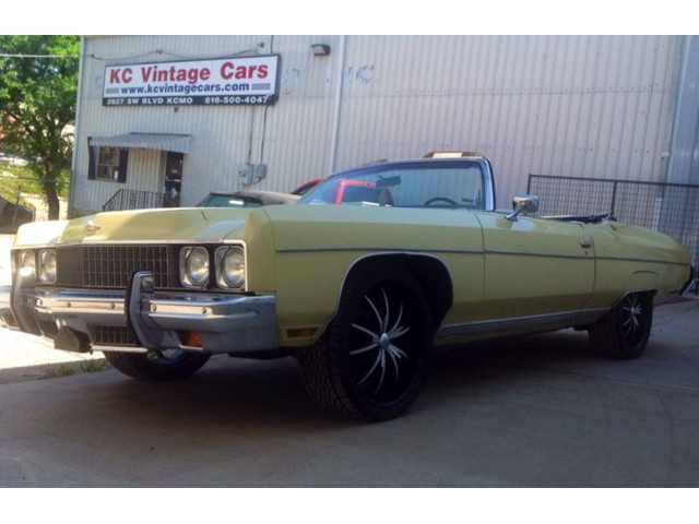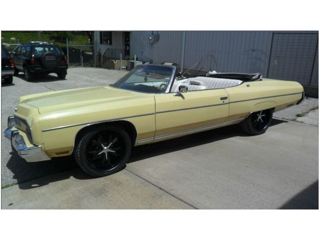 FOR SALE: 1973 Chevrolet Caprice Classic Convertible with new white top that retracts and extends perfectly. 350 Motor. Power Steering. Power Brakes. Power Top. 47.134 miles. Original paint. This car has one of THE best A/C units. Nice fender skirts. White interior in great condition. Custom wheels. Spare tire with cover. Boot. Not only does this great car come with the original 8-Track tape system, there's a new Kenwood AM/FM Stereo with CD player and a Legacy Amplifier in the trunk. It isn't hard to imagine yourself on the open road, top down, your favorite tunes plaing on the radio. Everything about this car says, "freedom".