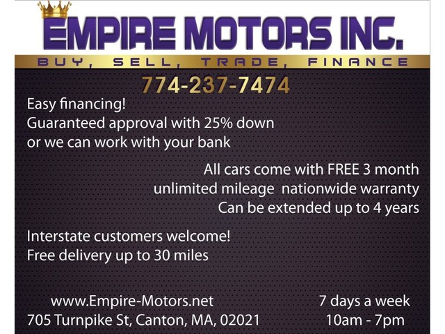 empire.motors is a registered eBay user name of Empire Motors Inc. Empire Motors is a Massachusetts Dealer operating under Massachusetts license number 11. Empire Motors is located at 705 Turnpike St, Canton, MA, 02021. Empire Motors's office can be reached at 1-774-237-7474. Visit us 10 am to 7 pm or till 9 pm by appointment! 7 days a week!