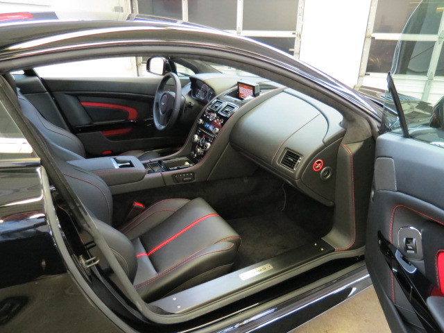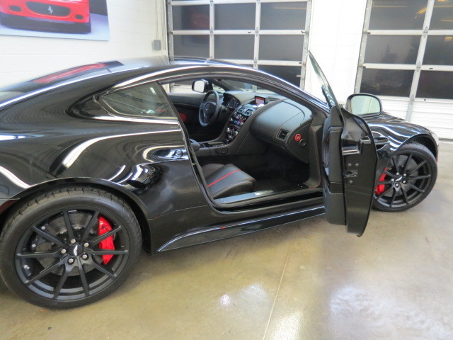 Ours on display is Jet Black on an all Obsidian Black Leather, Equipped with 7 speed Sportshift III Automated Manual Transmission, 565 max horsepower, 4 wheel ventilated, Carbon Ceramic disc brakes, 3 stage Adaptive Damping System(ADS), Servotronic steering, Bluetooth, Navigation,  Aston Martin 700w Premium Audio, Red Brake Calipers, Heated Front Seats, Black Meshes, Front Park Sensors, Carbon Fibre Paddles, Carbon Fibre Side Strakes, Satin Black Lightweight Wheels w/Corsa.