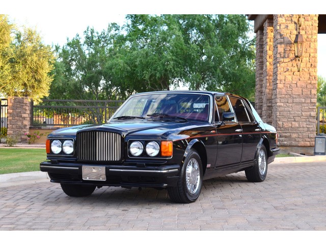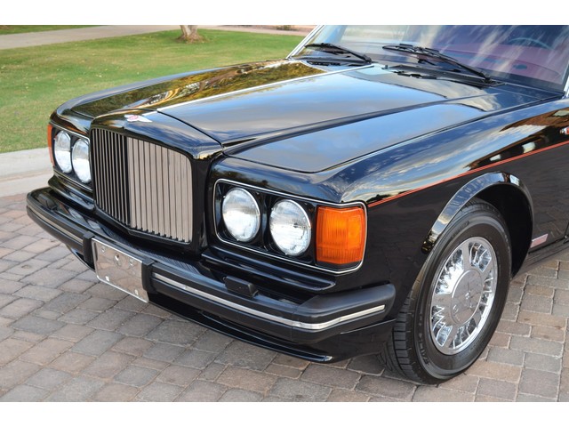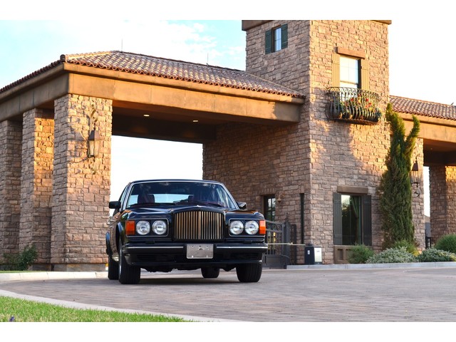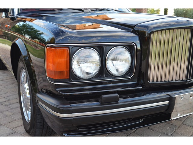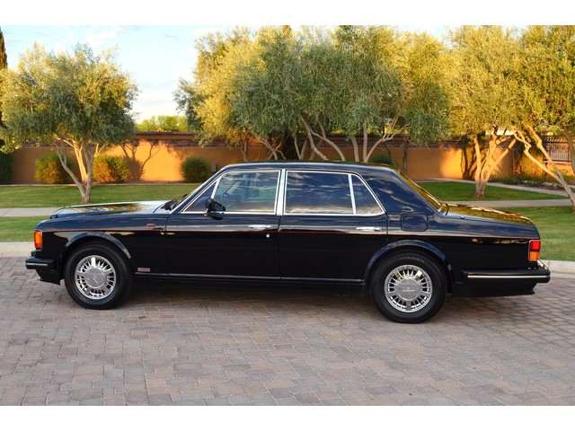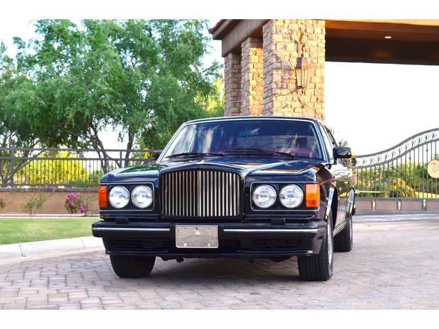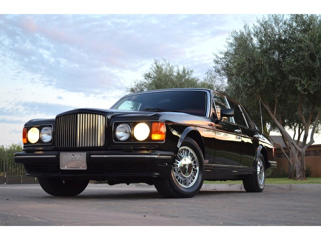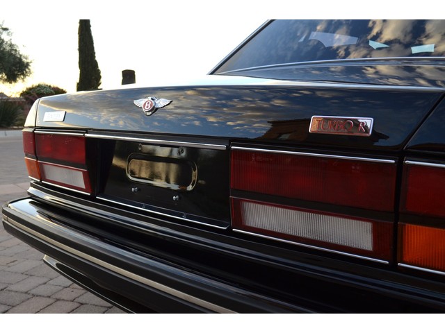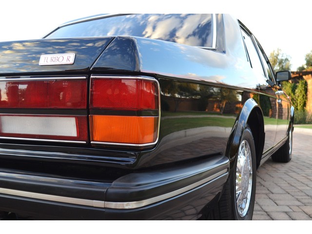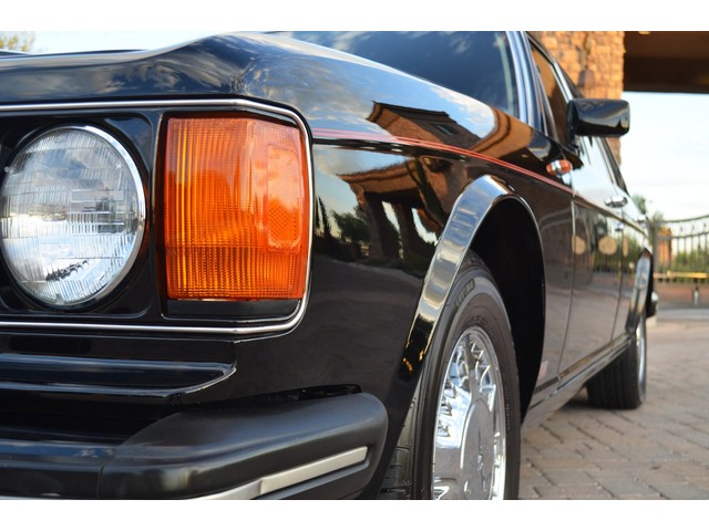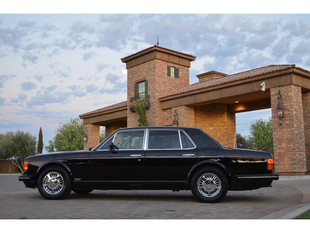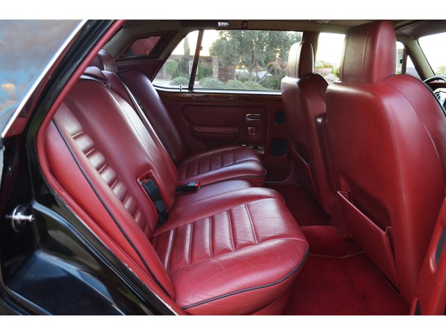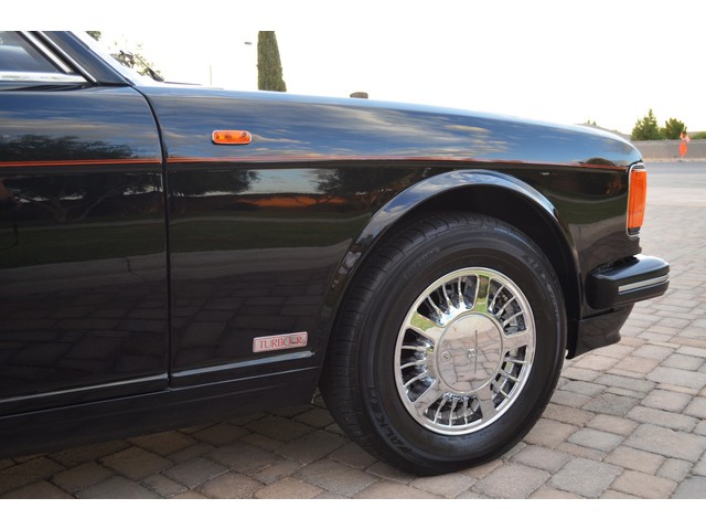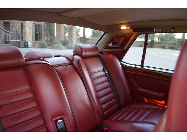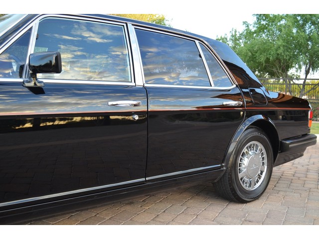 European Motor Studio is proud to offer this gorgeous 1990 Bentley Turbo R Saloon finished in Masons Black over Burgundy Hides with contrasting Masons Black piping. This beautiful Turbo R Saloon left the Crewe production line in July of 1989 and was invoiced to Rolls Royce/Bentley North America. The car was then delivered to Steingold Bentley/Rolls Royce where it sold to its first owner in late 1989. The car then moved to Alabama with the second owner in 1995 who has had the car ever since European Motor Studio brought the car to Arizona. The Masons Black paint finish on the car is still in excellent condition showing a beautiful deep luster free from any major scratches, or defects (just a few tiny stone chips in the front of the nose). The body of the car is in outstanding condition and is laser straight and free from any damage, rust or corrosion. All of the chrome and exterior trim are still in excellent condition and free from any damage or fade (small ding on the front drivers side bumper guard).  The Burgundy hides are all original and in beautiful condition with excellent patina to them. The driver and passenger seats show minimal wear and creasing but absolutely no heavy cracking, scuffing or tears at all. The backseats are in excellent condition showing no real signs of use and all of the carpets are in fantastic unstained condition. The headliner is stain and damage free as is the leather dash top, center console and door panels (small bit of leather just starting to peel back from the windshield). All of the wood veneer is in excellent condition showing almost no signs of wear (just a couple tiny hairline cracks) and all of the interior chrome and switchgear are in excellent unmarked condition. The 6.75 litre Bentley eight cylinder starts right up and idles beautifully without any issues. The car does not smoke under start up and does not smoke under acceleration. This Bentley shifts into gear with ease and accelerates through all of the gears without any issues. The cars steering is very solid and precise and does not drift, pull or vibrate at any speeds. The brakes feel very solid and responsive and do not show any signs of fade or squeaking. The suspension is very firm but smooth and free from any clunking or noises. The hydraulic rear end raises itself up as designed and keeps at a level ride height. The car has just had a full service including all of the plugs, injectors, brake accumulators and spheres, and the fluids and filter. All four tires were replaced at the end of 2011 and have only had about 1,000 miles on them. All of the electronics are working as designed, the radio and power antenna, all four windows, the door locks, the power seats and heated seat warmers, the AC and heater, all of gauges, all of the interior lights and dash lights and all of the exterior lights are all working as designed. The factory Bentley chrome wheels are in outstanding condition and free from any curb rash or damage. The car has its original Bentley spare tire, jack and jack tools, original Bentley tool kit, and all of its original owners manuals, warranty books, service books which are stamped by the dealership Bentley keys and remote , original rear seat foot rests, and a clean and clear box A actual miles title. This is a beautiful Turbo R Saloon which came from a time where money was absolutely no object in the process of building and hand assembling cars. These are getting rarer and harder to come by in excellent condition that have been well looked after and maintained.