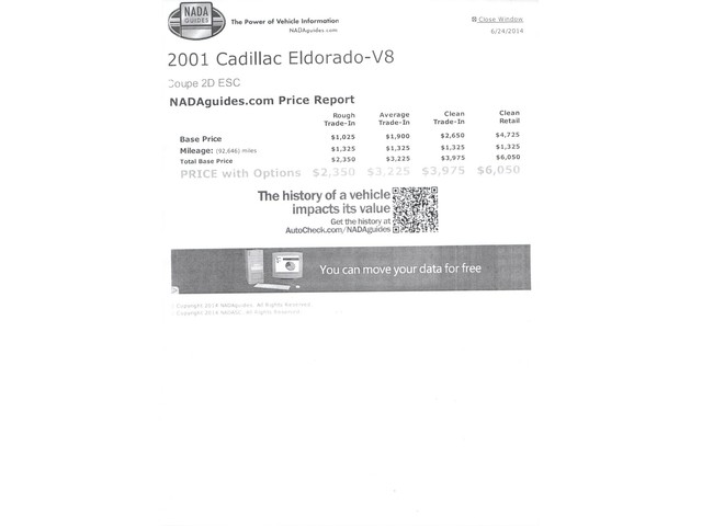 AUTOCHECK HISTORY REPORT This 2-owner 2001 Cadillac Eldorado ESC has a clean history report with no reports of accidents, flood damage, etc. The title is clear and is in our possession. AutoCheck gives this vehicle a 69 rating. Similar vehicles have a 30-56 average rating. We use AUTOCHECK rather than CARFAX because the report is more detailed and accurate. The complete AUTOCHECK report can be emailed to you upon request.