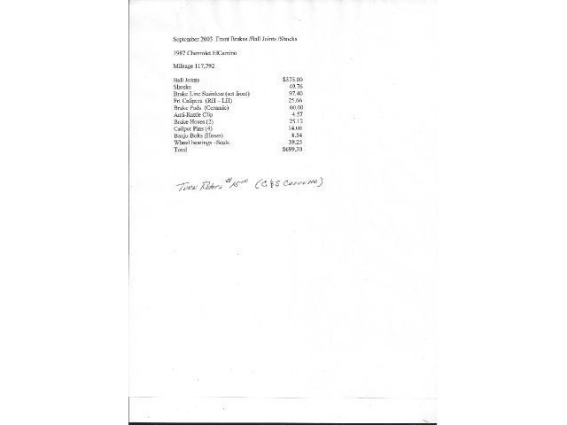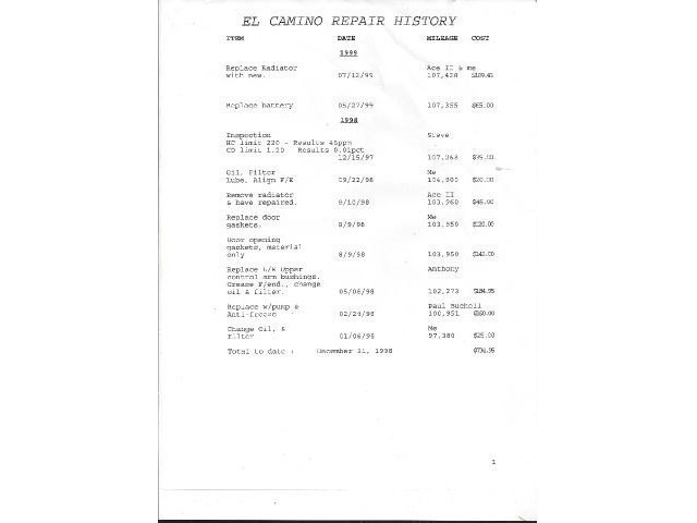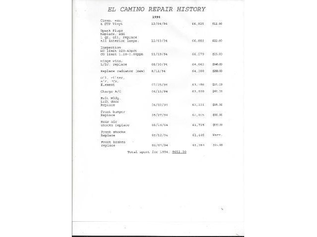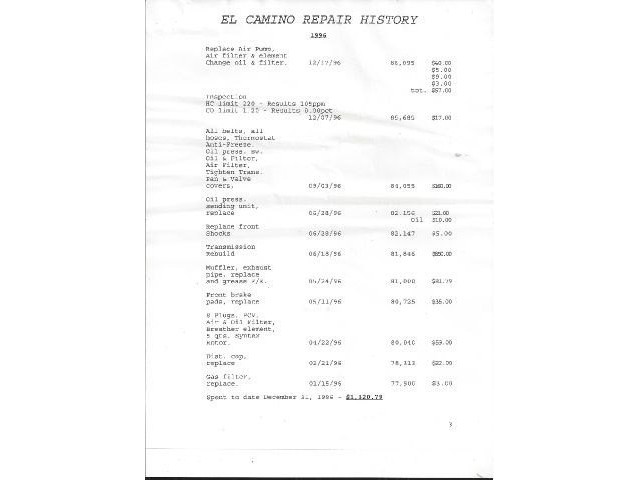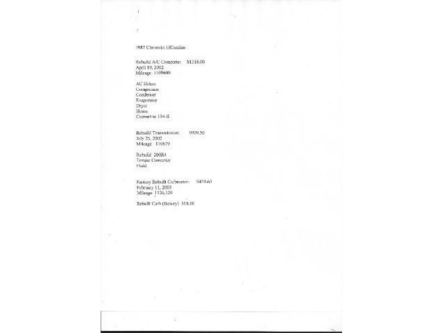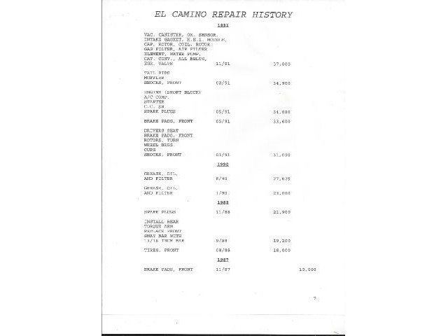 Looking for an 80's El Camino that is in excellent condition inside and out with no rust with a full service history? It would normally be too much to expect but that is exactly what we are offering. This car comes with a 2 inch file including date and mileage log for every service starting in 1988. The evidence is clear, The evidence is clear, the owners were mature, responsible and attentive. Rare to find ownership like this. Most callers are hoping for paperwork like this on cars we have advertised but unfortunately 99% of the cars we get have little more than the title and a set of keys. Check out the log we have and each entry has a matching repair order and receipt. The condition of the car currently s excellent. The paint and body are exceptionally nice. no rust and all panels are straight with very good fit and finish as should be expected on an original well cared for 87 El Camino. The interior is also in very good condition and appears to be, for the most part all original. dash, gauges, radio, AC, heat, defrost, horn, lights, etc in perfect working order. The engine runs perfectly and has a smooth shifting automatic transmission. no known mechanical issues. new tires, nice exhaust. Ready to be enjoyed by the next owner. Please call for more info 941-928-2339, We ship, finance and trade.