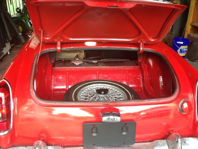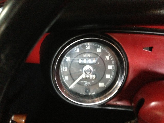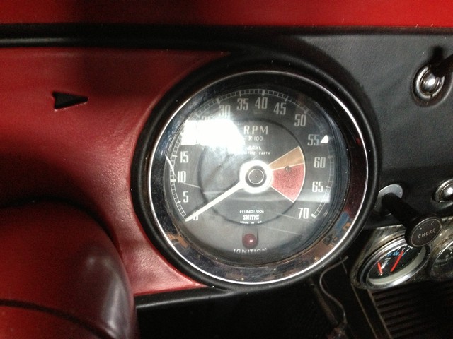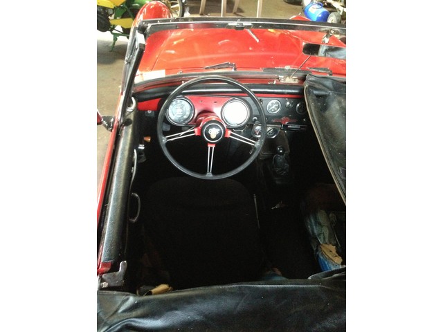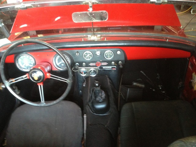 The exterior features a recent repaint in brilliant red complimented with all original trim, factory wire wheels and accessory luggage rack.  The exterior is in very good condition, there are a few minor dings that have been painted over, there is no rust and the floor pan is very solid and original.  The doors line up and open and close as they should.  A factory tonneau cover is included and has two minor tears at the stitching which can be repaired.  The original top and frame are included with the car, but the top will need to be replaced, the frame is perfect.  Also included are stone guards and yellow fog covers for the headlights.  A unique aftermarket hood scoop is also included in the sale. The  trim is not all perfect but very good and all original to the car.  The tires are a bit old and could be replaced, but they all hold air and the car drives well with them, if a bit hard.