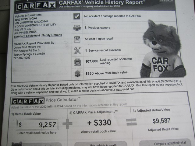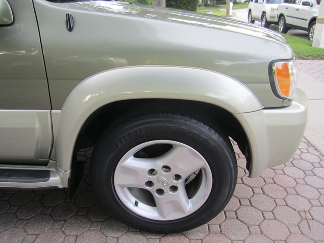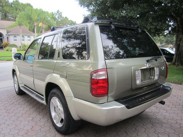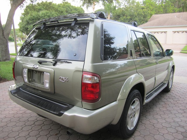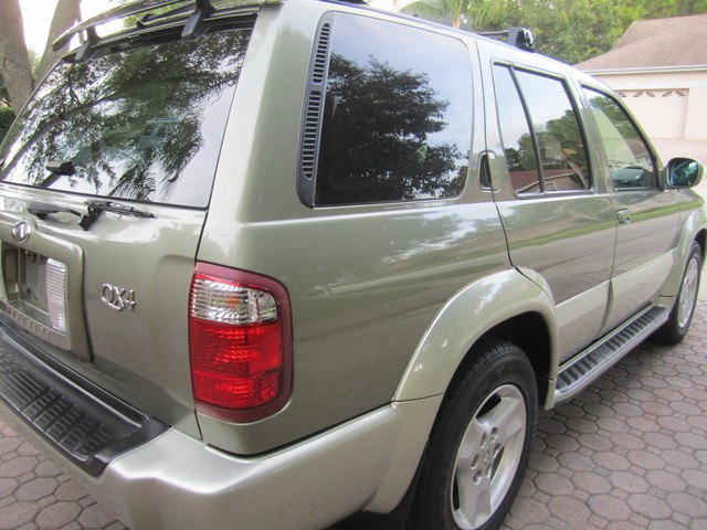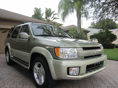 ***************PLEASE WATCH THE VIDEO AT THE END OF THIS DESCRIPTION******************ABSOLUTELY GORGEOUS 2003 INFINITI QX4 4X4, CLEAN CARFAX, NON-SMOKER, AND HAS ALWAYS BEEN IN FL, IT IS IMMACULATE AND IN PRISTINE CONDITION. IT HAS HAD ONLY 3 REGISTERED OWNERS, ALWAYS ADULT OWNED, AND HAS NO SIGNS OF KIDS, AND LOOKS TO HAVE BEEN ALWAYS GARAGE KEPT AND ALWAYS PROPERLY MAINTAINED, THIS BEAUTIFUL INFINITI LOOKS FANTASTIC INSIDE AND OUT. INTERIOR IS IN EXCELLENT CONDITION, THE CARPET, THE MATS AND LEATHER SEATS ALL LOOK  FANTASTIC, NO ODORS, NEVER SMOKED IN, LOOKS LIKE NO ONE HAS EVER BEEN IN THE BACK SEATS. EVERYTHING THAT WE COULD TELL WORKS GREAT. HAS JUST BEEN SERVICED, (NEW VALVE COVER GASKETS ,CLEANED THROTTLE BODY), AND IT IS READY TO BE ENJOY BY THE NEXT OWNER, WHO WILL BE VERY HAPPY WHEN THEY RECIEVE IT. HAS NEVER BEEN IN AN ACCIDENT, THE EXTERIOR IS IN GREAT CONDITION AS WELL, THE PAINT LOOKS AND SHINES LIKE NEW, IT HAS AN ADJUSTABLE LUGGAGE RACK, REAR SPOILER. THE UNDERNEATH OF THIS BEAUTIFUL SUV IS SPOTLESS, EVERY NUT AND BOLT ON IT STILL LOOKS BRAND NEW. THESE INFINITI QX4S ARE A TRUE LUXURY VEHICLE AND GIVES YOU A RIDE AND DEPENDABILITY  YOU WILL ONLY EXPERIENCE IN THIS QUALITY OF MANUFACTURING. I AM GOING TO SELL THIS BEAUTIFUL QX4 INFINITI TO THE HIGHEST BIDDER AFTER THE LOW RESERVE HAS BEEN MET ON IT. PLEASE IF YOU HAVE ANY QUESTIONS PLEASE CALL JACK AT 727-460-4283 OR CAROL AT 727-798-7161 OR EMAIL US. THANK YOU,  GOD BLESS YOU, AND HAVE A GREAT DAY:)...