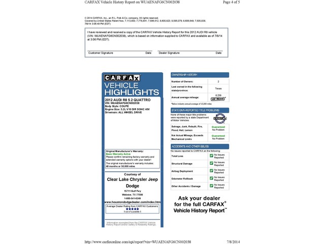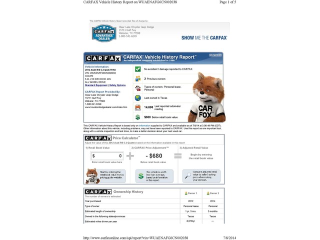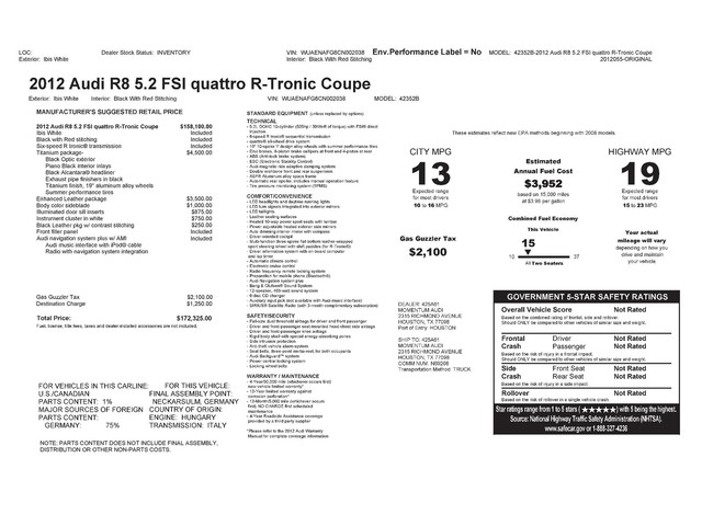 We are selling this vehicle as a consignment vehicle for a customer of ours that has purchased many cars from us. I sold this R8 to my customer when I worked at Audi Central Houston. We have sold many of his cars in the past year and he now wants to get a R8 GT. The original window sticker to this vehicle is $172,325. This Ibis White with Black/Red Stitching Interior is a beautiful combination for this R8. The R-Tronic Transmission shifts smoothly while maintaning a sport feel. This vehicle is a clean without any accidents or any paintwork whatsoever. No dings/scratches. This vehicle is well taken care of as well and has Michellin Pilot Super Sport tires. The tires were recently just put on and have great thread life left. This R8 V10 has brand new OEM brake pads as well as Audi Care Maintenance Package that I sold him when I worked at the Audi Dealership. This vehicle has a clean carfax of course and can be provided with a copy for a peace of mind. The remaining factory Audi warranty is still active and transfers with the vehicle.