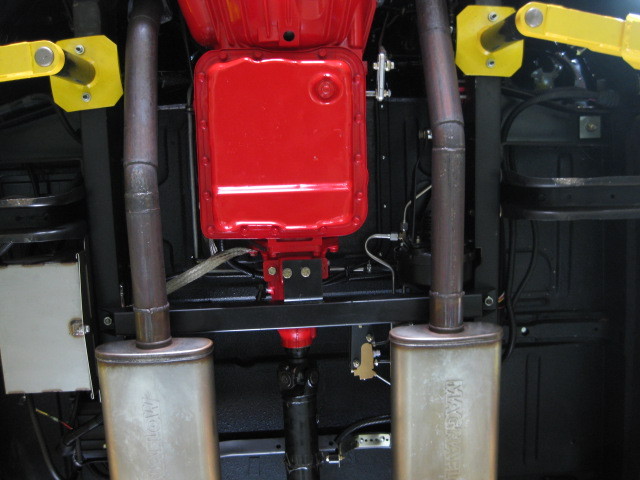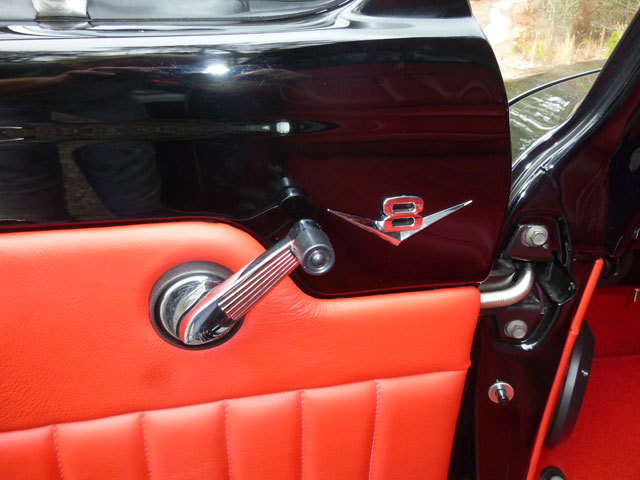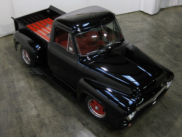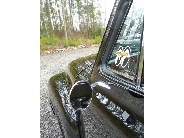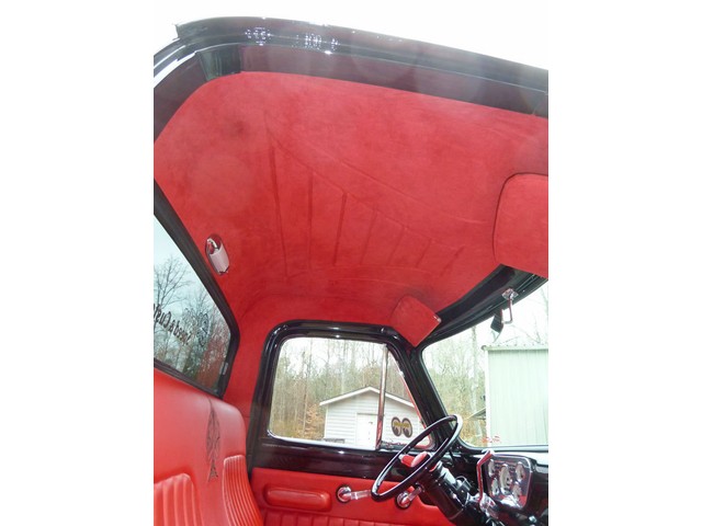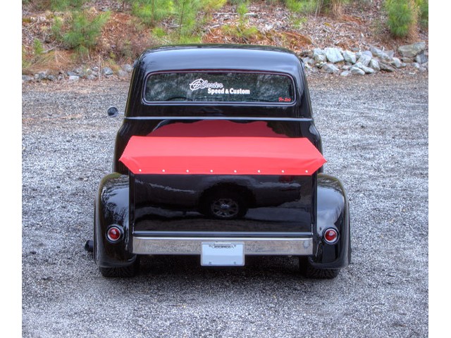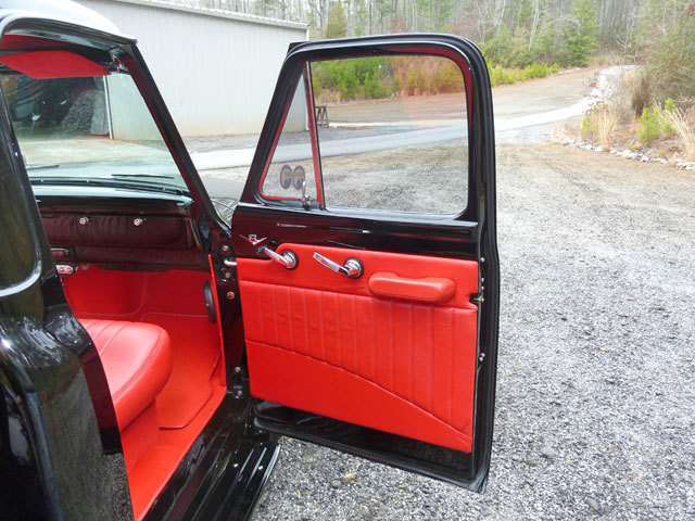 For starters, the truck’s pristine exterior sparkles like a jewel in classic House of Kolor Base & Clear coat Black. The body has been painstakingly and thoughtfully modified … no cutting corners here… paying homage to the Ford’s original character and charm. Shaved emblems and door handles, which now operate by remote control, offer modern convenience in keeping with the truck’s classic good looks. Equally important, the truck bed – complete with stainless strips and fasteners – pops nicely in eye-catching cherry red, a nod to the truck’s interior. The custom stainless exhaust system is seamlessly directed from under the running board with functional stainless zoomies.  And the red, 17” and 18” American Racing “Salt Flat Special” wheels and NITTO high performance tires provide just the right touch of bling to compliment the black beauty’s curves.