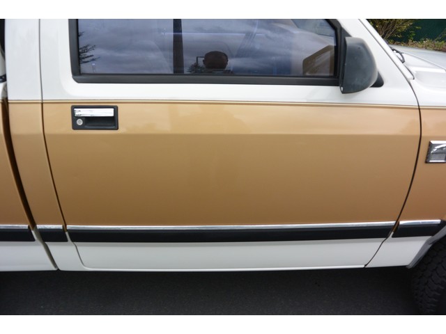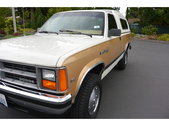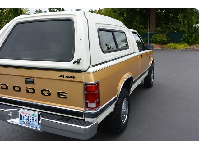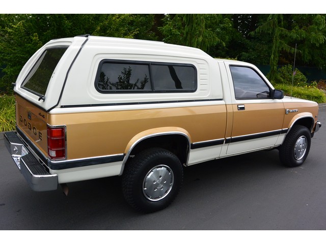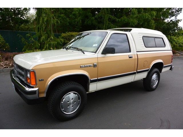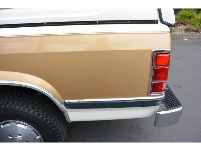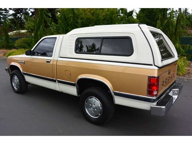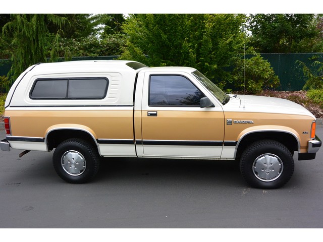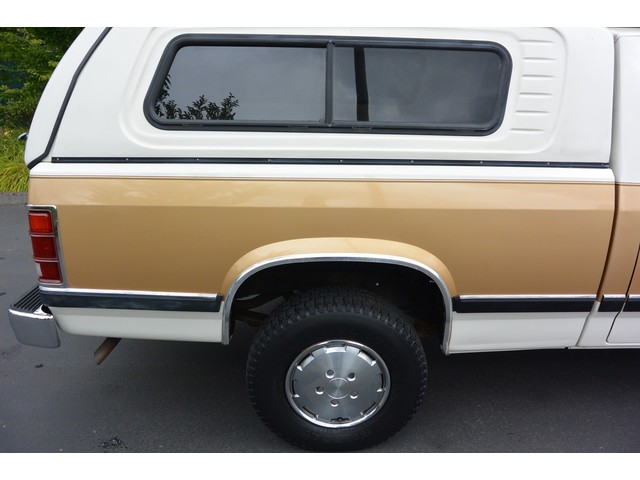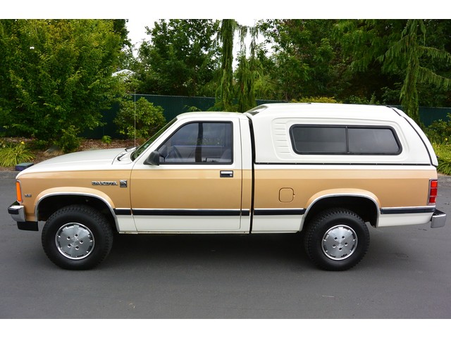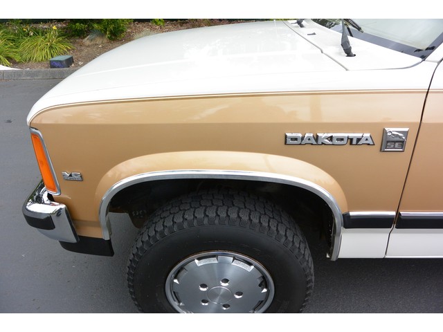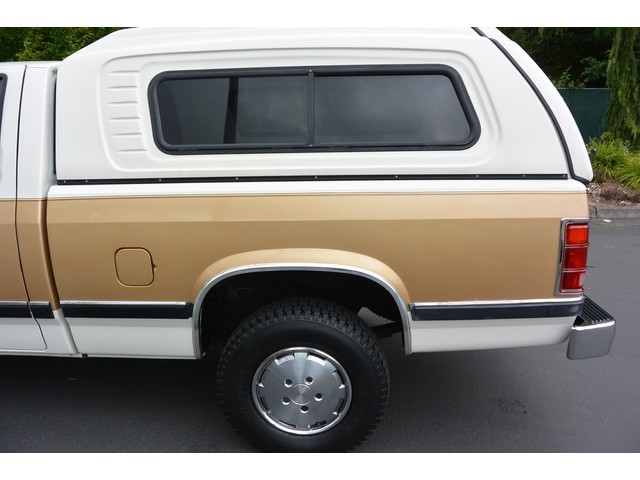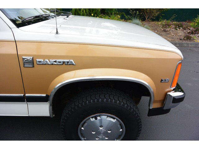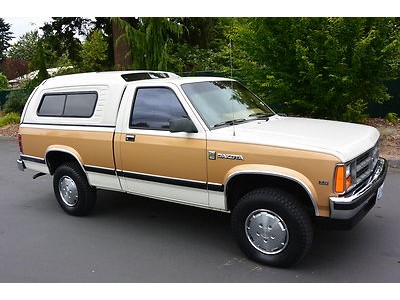 BODY-  THIS 4X4 DAKOTA HAS A CLOSE TO PERFECT VIRGIN BODY AND PAINT WITH CLEAN ACCIDENT FREE HISTORY AND DRY BODY WITH ZERO RUST ANYWHERE. GORGEOUS ALL ORIGINAL PAINT AND BODY IN THIS TASTEFUL OFF WHITE AND GOLD TWO TONE COLOR OPTIONS THAT HAS A DEEP AND HIGH GLOSS SHINE. ONCE YOU MAKE A COUPLE PASSES AROUND THIS TRUCK AND START TO LOOK PAST THE BEAUTIFUL GLOSSY ORIGINAL PAINT AND ARROW STRAIGHT BODY YOU WILL BEGAN TO NOTICE THE OTHER DETAILS THAT SHOW THE LOVE AND CARE THIS TRUCK GOT THAT HAS LEFT IT IN THIS INCREDIBLE CONDITION AND SUPER LOW MILES WITH ALL THE CHROME THAT IS ON THE BUMPERS AND TRIM THAT IS TRULY LIKE NEW, ALL THE COLORED LIGHT LENSES ARE NOT ONLY FULL OF DEEP COLOR , BUT ARE ALL STILL SHINY. ALL THE BLACK RUBBERS AND PLASTICS ARE IN EXCELLENT SHAPE WITH A RICH DEEP BLACK FINISH, THE BLACK MIRRORS ARE ALSO IN MINT SHAPE WITH NO ROCK CHIPS OR FADING AND THE REAR BUMPER IS THE NICEST IV EVER SEEN A NEAR 30 YEAR OLD BUMPER LOOK. THIS TRUCK SINCE NEW HAS HAD A PAINTED TO MATCH CANOPY THAT IS IN PERFECT SHAPE AND DIAMOND PLATE RUNNING BOARDS ON IT, SO THE BODY HAS REALLY BEEN PROTECTED FROM YOUR TYPICAL ELEMENTS AND WEAR. THE RUNNING BOARDS ARE CURRENTLY OFF THE TRUCK , BUT INCLUDED IF BUYER WISHES AND HAVE SAVED THE LOWER PART OF THE BODY THAT AMAZINGLY ONLY HAS A COUPLE SMALL STONE CHIPS THAT ARE NO LARGER THEN A PEN TIP ON THE WHOLE TRUCK. THE INTERIOR OF THE BED HAS CLEARLY NEVER BEEN USED AS A TRUCK AND IS IN EXCELLENT SHAPE ALONG WITH THE INSIDE OF THE CANOPY AND THE REAR HATCH STILL STAY UP BY ITSELF! THE ONLY REAL WEAR MARKS BESIDES THOSE COUPLE TINY STONE CHIPS IS SOME LARGER CHIPS ON FRONT FASCIA OF HOOD, A SMALL SCUFF ON THE PASSENGER FRONT BOTTOM SIDE OF THE BED BETWEEN THE REAR TIRE AND CAB MEETING POINT AND THE THIN CHROME MOLDING ALONG THE SIDE HAS HAD THE CLEAR TOP COATING START TO LOOSE IT'S ADHESIVE IN A COUPLE SPOTS. THIS TRUCK CLEARLY WAS LOVED AND BABIED AND IT'S HARD TO DESCRIBE HOW CLEAN THIS TRUCK IS FROM TOP TO BOTTOM, BUT IT IS THE NICEST TRUCK IVE EVER SEEN IN ORIGINAL CONDITION.  THIS TRUCK IS TRULY ALMOST PERFECT