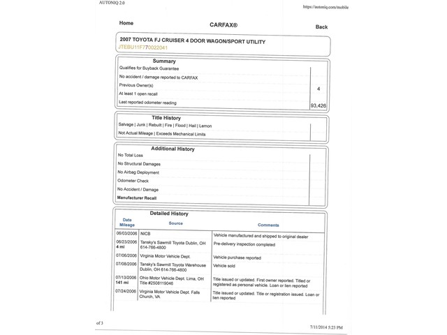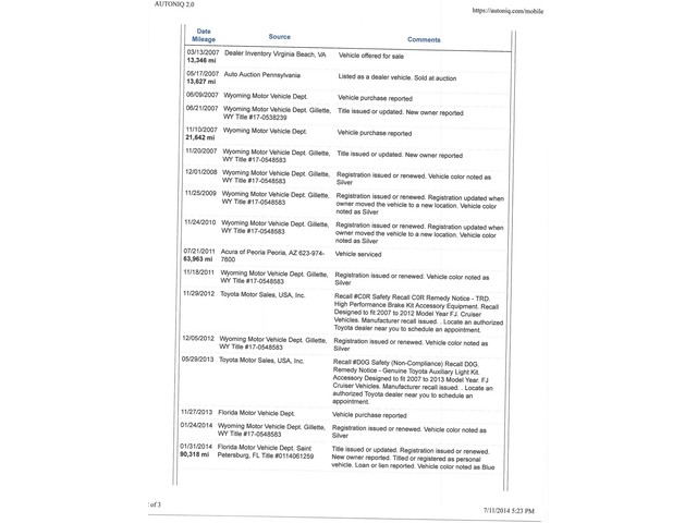 *Clean Carfax that is shown below the pictures. This FJ Cruiser has never been involved in an accident. Clean and clear Florida title.
