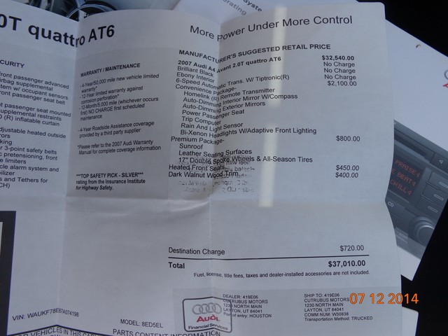 All service has been performed by the Audi dealer here in Las Vegas and in Utah.  I have all books and service records including the window sticker.  It has the 2.0 liter turbo charged engine and automatic transmission.  Of course it is an AWD Quattro.  It was originally equipped with both the Convenience and Premium packages.  They include leather upholstery, Xenon lights, dual power & heated seats and moonroof.  Most all other luxury options are standard. It sticker priced for over $37,000.