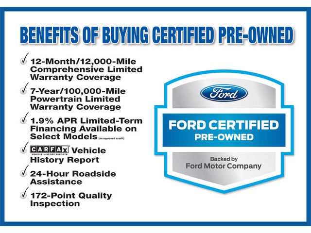 This Ford Certified Pre-owned vehicle has gone through an intensive 172 point inspection checklist and comes with a comprehensive vehicle history report, a 7 Year / 100,000 mile power train limited warranty, plus a 12 month / 12,000 mile comprehensive limited warranty covering up to 500 components. This CPO also provides Roadside Assistance* which includes reimbursement s of up to $100 towing, $75 Destination allowance, $500 breakdown travel expense and $30/day rental car for up to 5days in addition to complimentary 24hr/7day toll free call center for battery jump starts, flat tire changes, lockouts or fuel delivery. * Please contact us for complete terms and conditions.