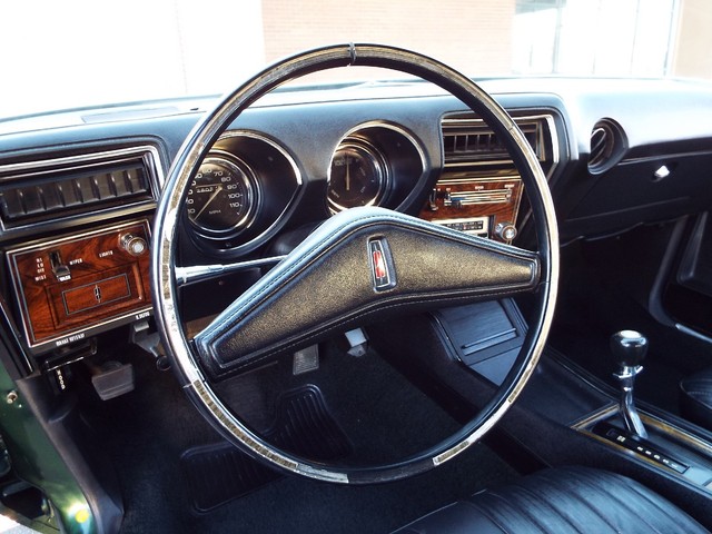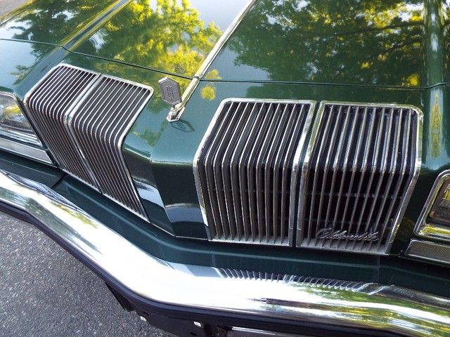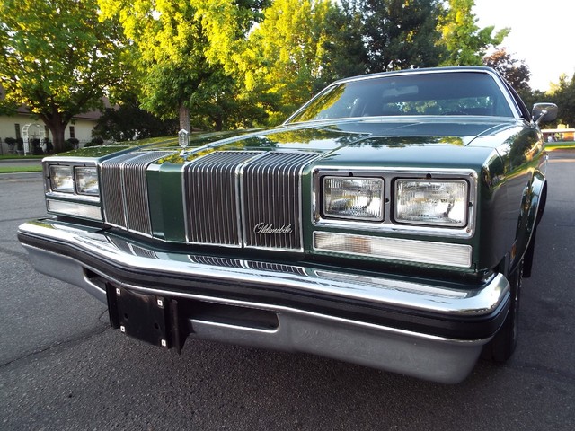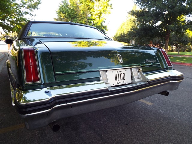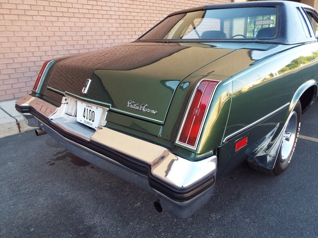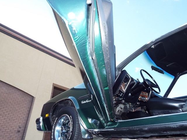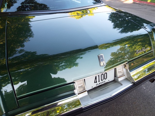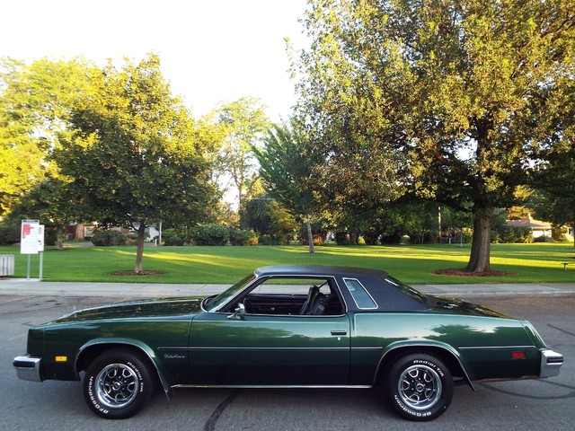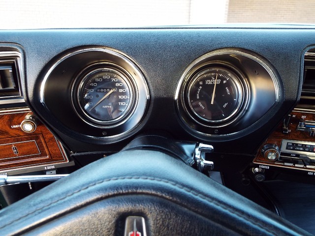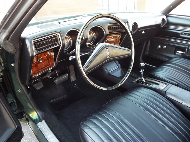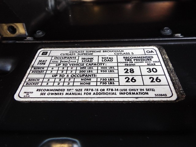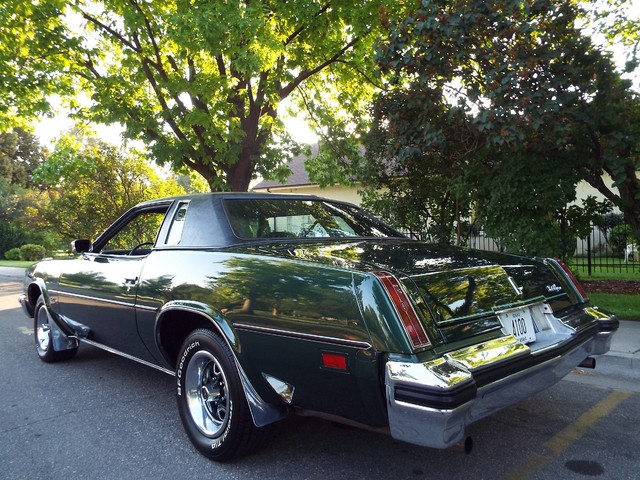 The car has what appears to be the VERY STRONG - ORIGINAL - Code "R" - 350 CID V8 motor in it which is running very well indeed. The motor also still retains its ORIGINAL 4 barrel intake manifold, ORIGINAL  exhaust manifolds, ORIGINAL valve covers, ORIGINAL 4 barrel carb and the ORIGINAL air cleaner housing. Sounds GREAT too with the "Throaty" all stainless steel true dual exhaust system !! The engine is backed by a SMOOTH - REBUILT WITH A MILD SHIFT KIT - three speed automatic transmission that also functions very well. The BEAUTIFUL - MOSTLY FACTORY ORIGINAL !! - Code "19W" - Black vinyl and faux wood grain accented Cutlass Supreme bucket seat interior in this BEAUTY is STUNNING including a VERY NICE MOSTLY ORIGINAL  Black vinyl front bucket seats with factory headrests, VERY NICE  ORIGINAL Black vinyl rear seat, VERY NICE ORIGINAL Matching Black vinyl and faux wood grain accented door panels, VERY NICE ORIGINAL Black and faux wood grain accented center console, VERY NICE ORIGINAL Black carpeting, VERY NICE ORIGINAL Black vinyl headliner, VERY NICE ORIGINAL Black vinyl sunvisors, VERY NICE ORIGINAL Black and faux wood grain accented dash, VERY NICE ORIGINAL factory guage clusters, NICE ORIGINAL Oldsmobile steering wheel and a VERY NICE ORIGINAL Black vinyl dash pad with NO CRACKS !! In my opinion your not going to find a much nicer MOSTLY FACTORY ORIGINAL interior in a 38 year old car than the one that is in this BEAUTY, UNBELEIVABLE !! The FACTORY ORIGINAL Black Full Vinyl top is also in VERY NICE condition for being original. The STUNNING - Code "49" - Dark Green Metallic exterior paint with light green pinstriping is EYE POPPING BEAUTIFUL with very little to no wear showing other than several small chips and imperfections and is still bright, shiny and  looks STUNNING as you can clearly see in the pictures below and the video above. The - Code "19W" - Black vinyl interior with the  complementing - Code "49" - Dark Green Metallic exterior with the  ORIGINAL Black vinyl top is a GREAT color combination indeed ! How could you get any better ?!! The CLEAN - SOLID trunk also sports the ORIGINAL charcoal liner, a full size spare tire, jack and lug wrench.  This Cutlass Supreme is nicely equipped including factory power steering, factory power brakes with discs up front, optional center console mounted locking shifter, factory front and rear seat belts,  working original Delco AM / FM stereo radio, factory guage cluster with a 110 MPH speedometer, good glass, good heater and defroster, original day / night rear view mirror, factory rear window defogger, original chrome driver's remote side view exterior mirror, factory power wipers and factory back up lights. All of the ORIGINAL light lenses and reflectors are also clear, bright UNCRACKED and BEAUTIFUL !!