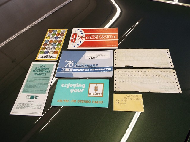 ***  FACTORY ORIGINAL 1976 OLDSMOBILE OWNER'S MANUAL - FACTORY ORIGINAL ASSEMBLY LINE BUILD SHEET - FACTORY ORIGINAL - CORRECTLY MOUNTED - OLDSMOBILE COWL  MOUNTED DATA PLATE - FACTORY ORIGINAL - CORRECTLY MOUNTED - DASH MOUNTED OLDSMOBILE VIN TAG - FACTORY ORIGINAL 1976 OLDSMOBILE MAINTENANCE SCHEDULE BOOKLET - FACTORY ORIGINAL  OLDSMOBILE AM / FM STEREO RADIO INFORMATION BOOKLET - FACTORY ORIGINAL OLDSMOBILE CONSUMER INFORMATION BOOKLET - FACTORY ORIGINAL 1976 OLDSMOBILE EXTERIOR COLORS BROCHURE - FACTORY ORIGINAL DRIVER'S SUNVISOR EMISSIONS SYSTEM  STICKER !!  ***