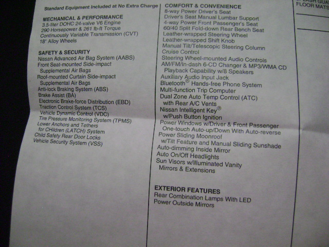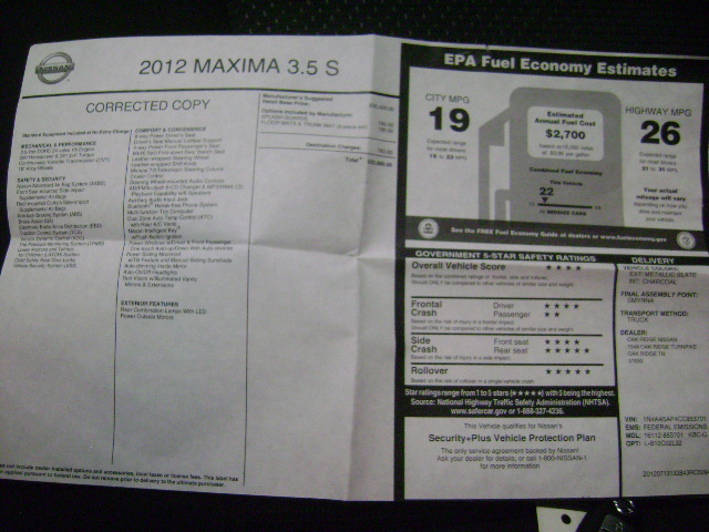 The 2012 Nissan Maxima S comes standard with variety of convenience and saftey features which include: Power Sunroof, Leather Sport Steering Wheel with audio, cruise, and BlueTooth Controls, Dual Electronic Thermostat with Auto setting, Auto up/down Front Windows, Premium 8-Speaker AM/FM/6-CD Player with MP3 decoder and Aux input, Auto dimming Rearview Mirror, ABS w/Brake Assist, 6 Standard Airbags, Aluminum Alloy Wheels,