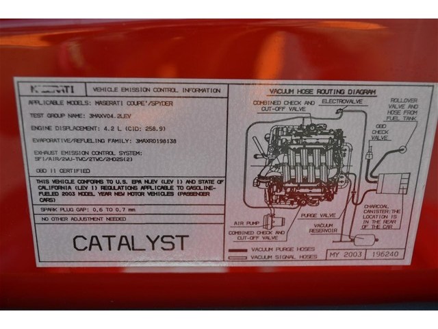 Joe Walsh's Maserati may do 185 but our Maserati contains nearly 400 horses! This 2003 Maserati Spyder Cambiocorsa is any gearhead's dream with lavish premium leather seating and a powerful 4.2L V8 engine that seems to pump pure adrenaline through the steering wheel! Drop the top on this convertible and peel off down any strip of pavement for the most enjoyable ride you'll receive on four wheels! It also comes equipped with a single disc cd player all power features paddle shifters and SUPER LOW MILES! Standard features include: Remote power door locks 4-wheel ABS brakes Convertible roof - Power Air conditioning with climate control Cruise control Driver memory seats Memory settings for 2 drivers Multi-function remote - Trunk/hatch/door Power heated mirrors Passenger Airbag 8-way power adjustable drivers seat 390 horsepower 4.2 liter V8 DOHC engine with variable valve timing Tilt steering wheel Fuel economy EPA highway (mpg): 17 and EPA city (mpg): 11 2 Doors Rear-wheel drive Front fog/driving lights Tachometer Compass External temperature display Limited slip differential Chrome grill...