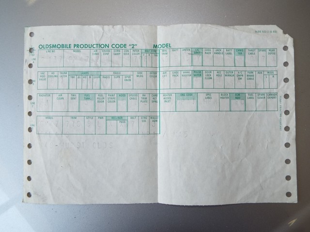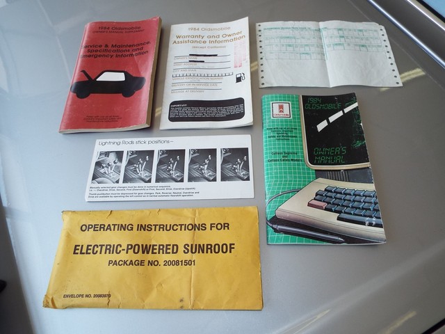 ***  FACTORY ORIGINAL - 1984 OLDSMOBILE OWNERS MANUAL AND SUPPLEMENT - FACTORY ORIGINAL - WARRANTY INFORMATION BOOKLET - ORIGINAL FACTORY BUILD SHEET - FACTORY ORIGINAL - HURST "LIGHTNING ROD" SHIFTER INFORMATION PAMPHLET - FACTORY ORIGINAL - 1984 OLDSMOBILE SERVICE AND MAINTENANCE MANUAL - FACTORY ORIGINAL - CORRECTLY MOUNTED OLDSMOBILE COWL MOUNTED DATA PLATE - FACTORY ORIGINAL - CORRECTLY MOUNTED BUICK DASH MOUNTED VIN PLATE - FACTORY ORIGINAL - TRUNK LID MOUNTED RPO STICKER - ORIGINAL JACKING INSTRUCTION STICKER !!  ***