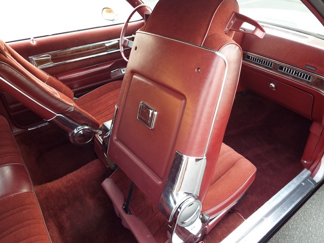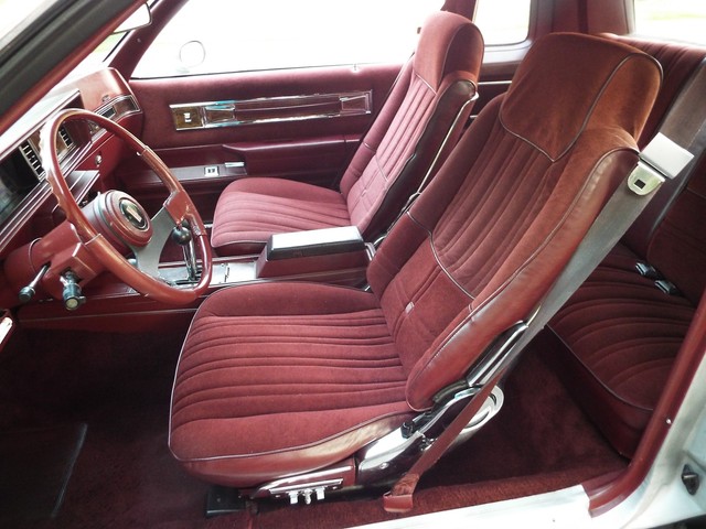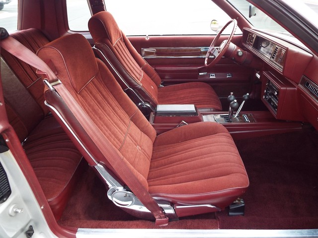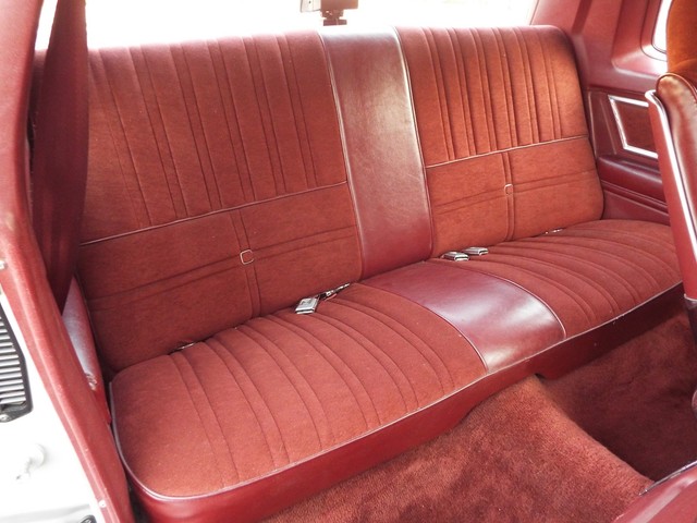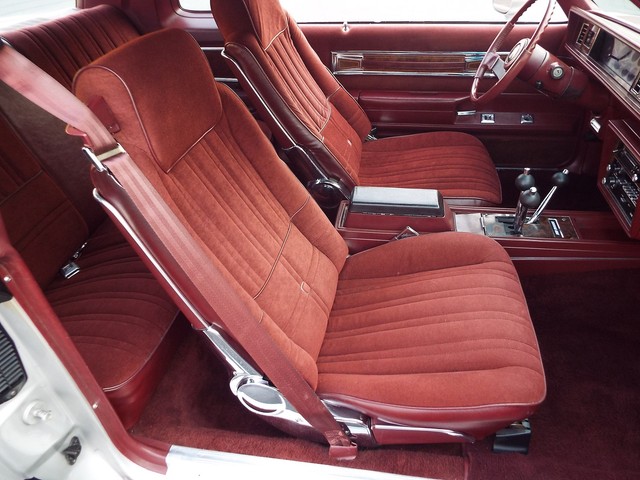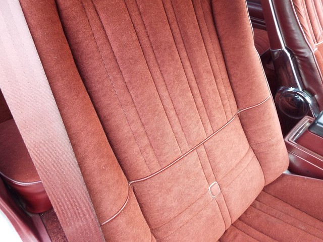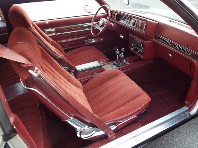 ***  VERY NICE - MOSTLY FACTORY ORIGINAL !! - CODE "25/55" - MAPLE RED CLOTH AND VINYL FAUX WOOD GRAIN ACCENTED CUTLAS SUPREME HURST / OLDS BUCKET SEAT INTERIOR !!  ***