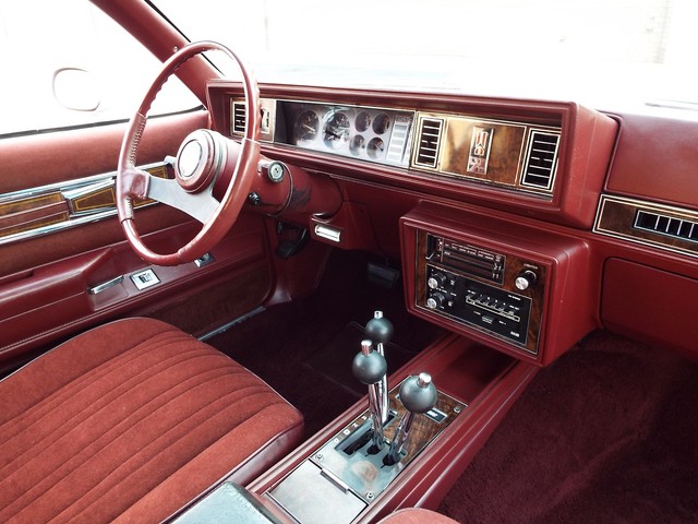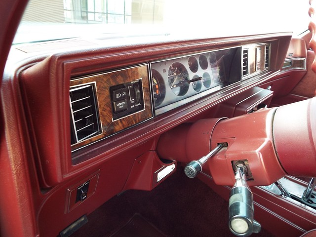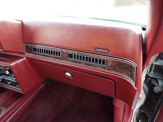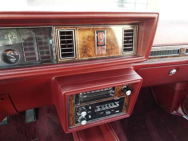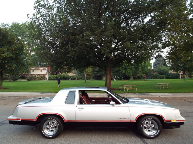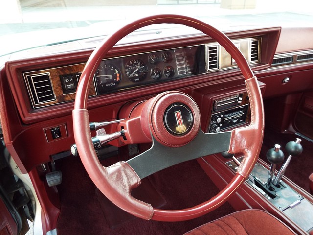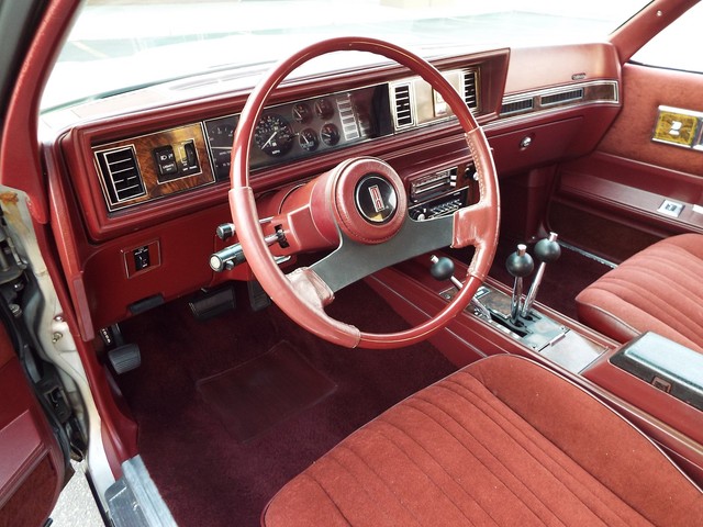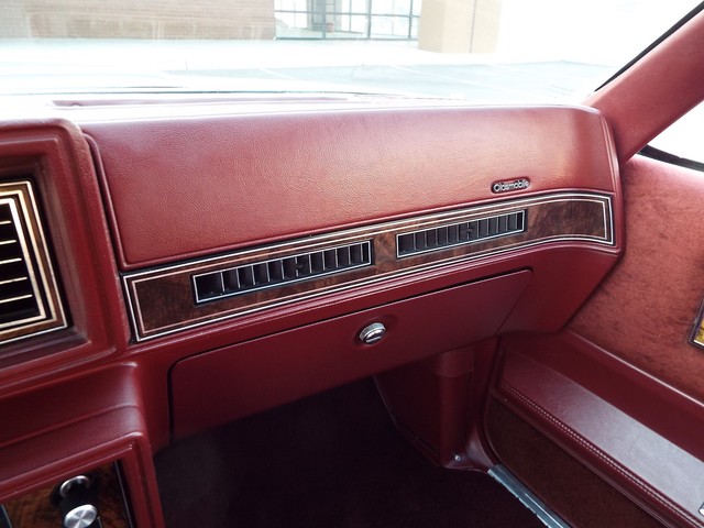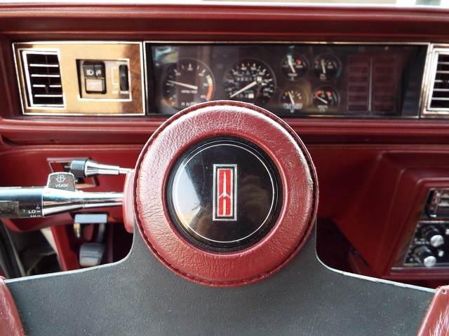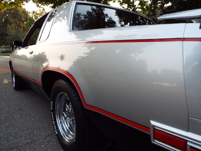 This BEAUTY has what appears to be the STRONG - ORIGINAL - Code "LV2" - 307 CID V8 motor in it and it is running very well. Sounds GREAT too with the "throaty" true dual exhaust system. The engine  still retains the ORIGINAL 4 barrel intake manifold, ORIGINAL valve covers, ORIGINAL exhaust manifolds, ORIGINAL chrome air cleaner housing and the ORIGINAL 4 barrel carb with electric choke. The engine is backed by a - SMOOTH - four speed "Hydromatic" overdrive  automatic transmission with Hurst three stick - "Lightning Rod" - console mounted shifter that also functions very well. The VERY NICE -  MOSTLY FACTORY ORIGINAL !! - Hurst / Olds Optioned - Code "25/55" - Maple Red cloth and vinyl faux wood grain accented bucket seat interior is in VERY NICE condition with VERY NICE Maple Red cloth and vinyl front bucket seats with factory headrests, VERY NICE ORIGINAL Maple Red cloth and vinyl rear seat, VERY NICE Maple Red cloth headliner, NICE ORIGINAL Maple Red cloth sunvisors, VERY NICE ORIGINAL Oldsmobile steering wheel, VERY NICE Matching Maple Red cloth and vinyl faux wood grain accented door panels, VERY NICE ORIGINAL Maple Red carpets, VERY NICE ORIGINAL factory gauge clusters, VERY NICE ORIGINAL Maple Red vinyl and fuax wood grain accented center console, VERY NICE ORIGINAL Maple Red vinyl and faux wood grain accented dash and a VERY NICE ORIGINAL Maple Red vinyl dash pad with NO CRACKS !! In my opinion you're not going to find a much nicer MOSTLY FACTORY ORIGINAL interior in a 30 year old car than the one that is in this BEAUTY, UNBELIEVABLE !! The - Code "19/17" - Silver upper and Black lower exterior exterior paint with red and silver Hurst / Olds body accents is EYE POPPING BEAUTIFUL  showing several small chips and imperfections but is still bright, shiny and looks AWESOME as you can clearly see in the video above and pictures below. The Hurst / Olds optioned Maple Red cloth and vinyl interior and the two tone Silver and Black exterior is a BEAUTIFUL  color combination indeed ! How could you get any better ?!! This Car is a great runner and a real nice looker. In true Oldsmobile fashion this car is nicely equipped to say the least including factory power steering, factory power brakes with discs up front, good heater and defroster, factory air conditioning that is all there with a belt on the compressor but is not blowing cold, factory power windows, optional factory power sunroof, factory power door locks, 6 way adjustable power drivers seat, factory cruise control, factory trip odometer, factory tilt steering column, factory power delayed wipers, factory glove box mounted remote trunk lid release, factory dual sport remote side view mirrors, factory rear window defogger, factory guage cluster with tachometer, good glass, factory back-up lights, front and rear seat belts, factory power antenna, factory Hurst "Lightning Rod" center console shifter, working original AM / FM / Cassette player digital stereo radio, original day / night rear view mirror and a factory eye-level 3rd brake light. This Cutas Supreme Hurst / Olds has great looks and AWESOME V8 POWER to boot ! There are not many of these left on the roads for sure !