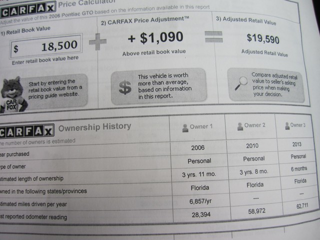 **************PLEASE WATCH THE VIDEO AT THE END OF THIS DESCRIPTION**************ABSOLUTELY GORGEOUS 2006 PONTIAC GTO THAT IS JUST AWESOME, ONE OF THE MOST FAMOUS SPORTS CARS EVER AND THIS IS THE "LAST YEAR" THEY WILL EVER BE MADE, A TRUE AMERICAN CLASSIC THAT IS SURE TO BE VERY COLLECTABLE IN THE YEARS TO COME...LEATHER INTERIOR, POWER SEAT, 6DISC CHANGER, AUTOMATIC TRANSMISSION ($1,300.00 ADD) 3.46 REAR-END, LS2 400HP 400LBS TORQUE ONE OF THE FASTEST SPORTS CAR OF IT'S TIME, 200 MHP SPEEDOMETER, AND FOR THE LOW RESERVE ON THIS IT IS A "NO BRAINER" TON OF CAR FOR THE MONEY...CLEAN CARFAX, CLEAN AUTOCHECK, NON-SMOKER, ABSOLUTELY IMMACULATE, AND THE INTERIOR IS IN EXCELLENT CONDITION, EVERYTHING LOOKS LIKE NEW. THE EXTERIOR IS ALSO IN EXCELLENT CONDITION, THE PAINT LOOKS AND SHINES LIKE NEW, AND WITH ONE OF THE BEST COLOR COMBINATIONS THAT YOU CAN GET ON ONE OF THESE CLASSIC AUTOMOBILES. IT HAS THE FACTORY ALLOY WHEELS WITH SOME VERY NICE, BF GOODRICH TIRES WITH PLENTY OF TREAD REMAINING, BRAKES SEEM TO BE FINE AND IT HAS JUST BEEN SERVICED, WITH A FRESH OIL CHANGE AND FILTER. THIS ONE HAS BEEN VERY WELL TAKEN CARE OF SINCE BRAND NEW, HAS 14 SERVICE RECORDS DOCUMENTED ON THE (CARFAX REPORT), IT RUNS AND RIDES AND HANDLES LIKE NEW, AND WITH THE HEADERS AND EXHAUST SYSTEM THAT HAS BEEN ADDED TO THIS MONSTER, IT SOUNDS AMAZING!!!!...THE NEW OWNER WILL BE VERY VERY HAPPY WITH IT...PLEASE WATCH THE VIDEO AT THE END OF THIS DESCRIPTION AND IF YOU HAVE ANY QUESTIONS PLEASE GIVE US A CALL JACK AT 727-460-4283 OR CAROL AT 727-798-7161 OR EMAIL US. THANK YOU GOD BLESS YOU AND HAVE A WONDERFUL DAY.