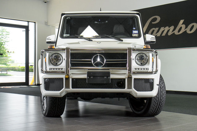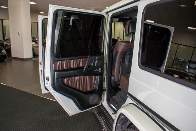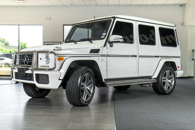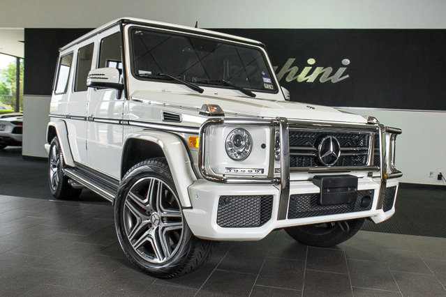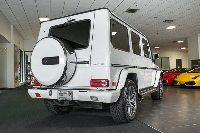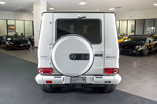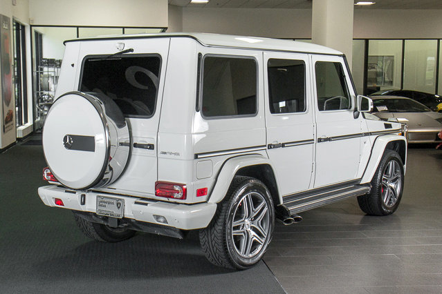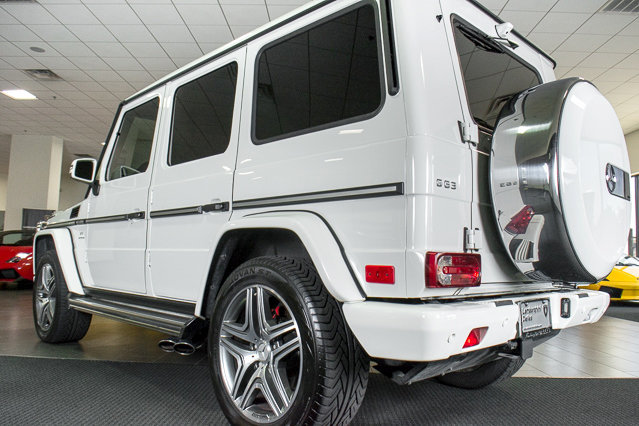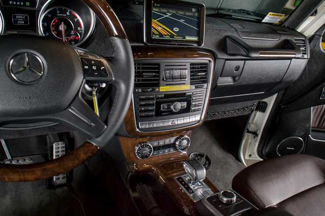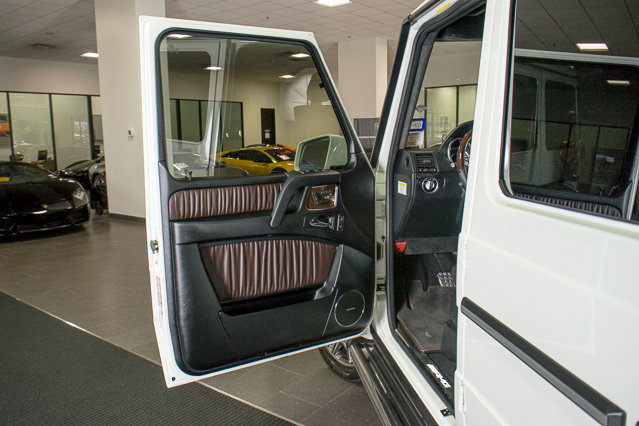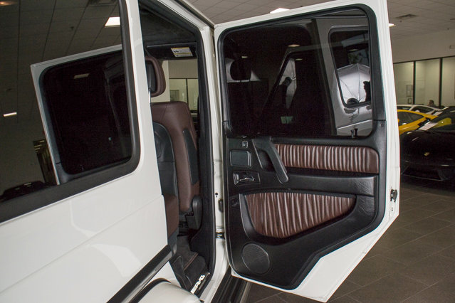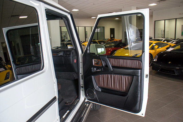 This is a smoke free Carfax certified 2013 Mercedes G63 AMG equipped with a 5.5L 544HP Twin Turbo V8 engine and a 7-speed automatic with sport shift transmission. This suv is finished in a beautiful Arctic White exterior color and Black with Auburn Brown leather interior along with Burl Walnut wood trim throughout.