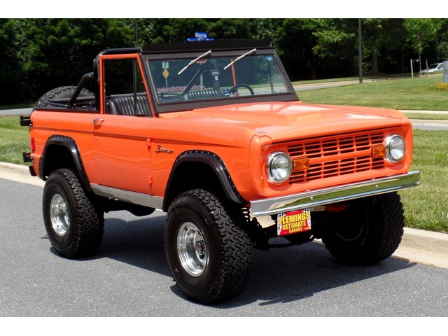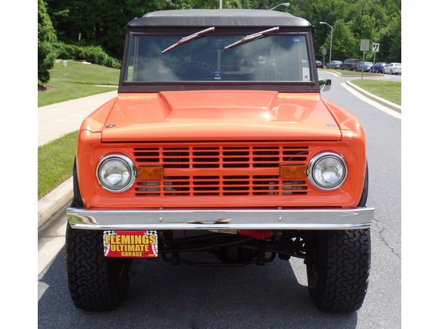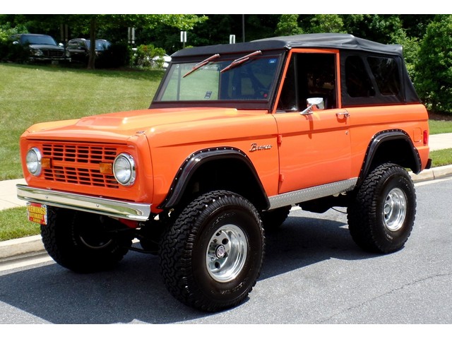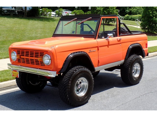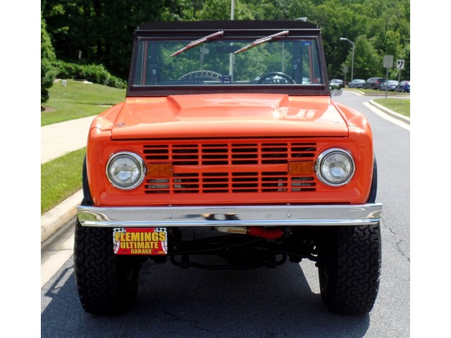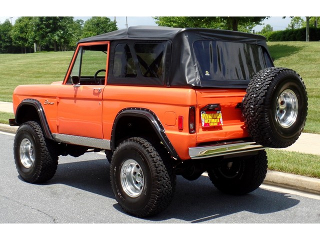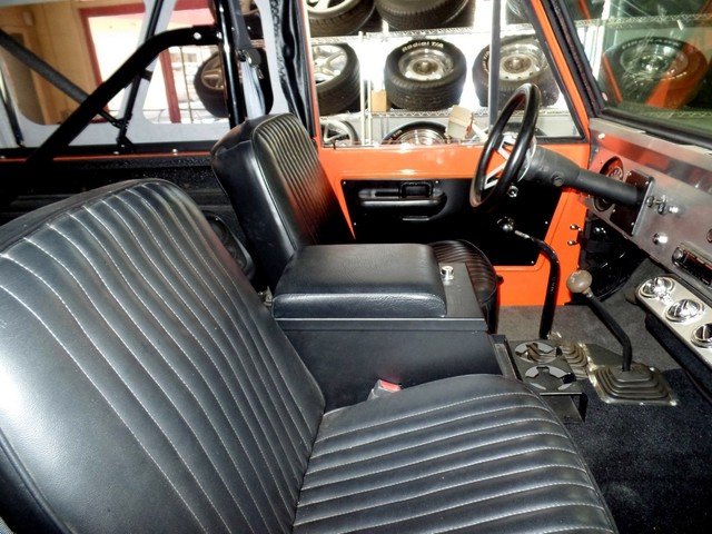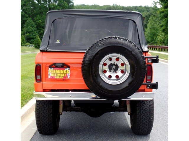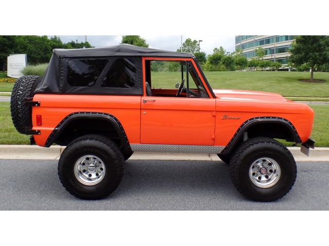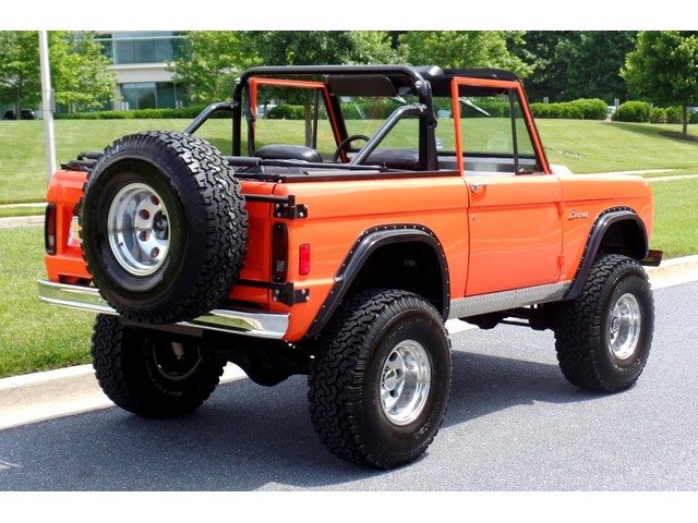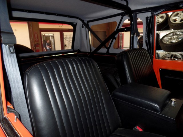 1977 Bronco 4x4. Freshyl rebuilt Ford 5.0 liter/302cid V8@300hp! Heavy Duty 4 speed manual transmission, factory transfer case + heavy duty front and rear differentials with locking hubs. Mirror finish Grabber Orange paint, new bucket seat interior with Rhino liner floors (Just hose it out!). Brand new black convertible top + bimini top. 4 point tubular roll cage.  Hard and soft doors. upgraded suspension with 4" lift, new heavy duty springs &  Rancho shocks. Ice cold modern air conditioning A/C and heat. Custom aluminum dash with full gauges. Fast ratio power steering, upgraded power disc brakes,great sounding dual exhaust. Fresh Eagle alloy wheels with BFG all terrain radials and rear mounted full size spare.