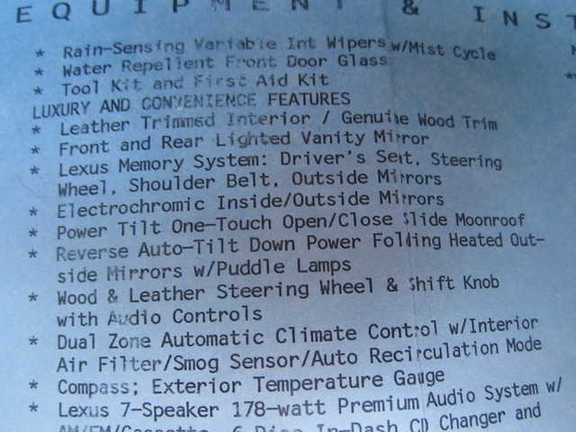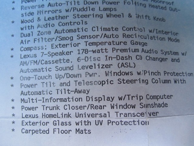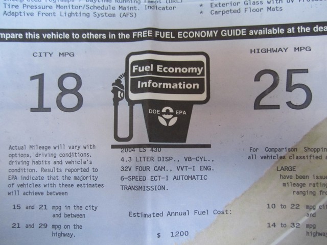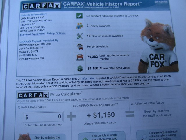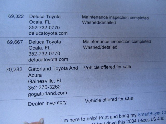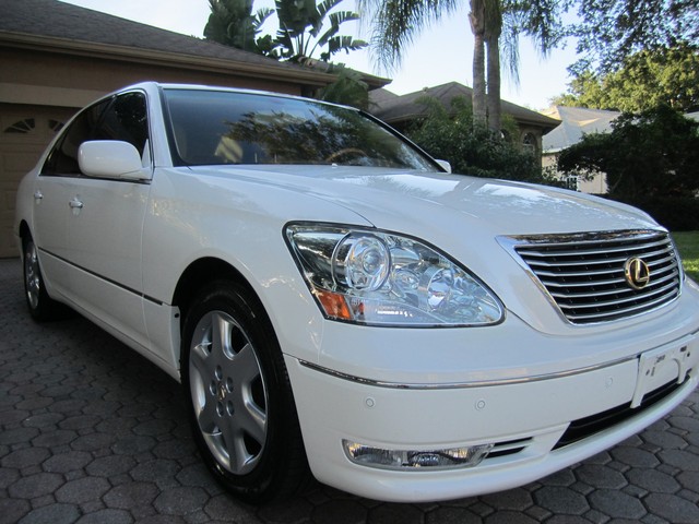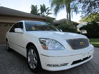 ************PLEASE WATCH THE VIDEO AT THE END OF THIS DESCRIPTION**************ABSOLUTELY GORGEOUS 2004 LEXUS LS430 WITH THE "LUXURY PACKAGE" THAT WAS BOUGHT BRAND NEW HERE IN FL AT (LEXUS OF ORLANDO) IT HAS BEEN A 1 FL OWNER SINCE IT HAD 15K MILES ON IT, THE PREVIOUS OWNER ONLY DROVE IT ABOUT 5K MILES A YEAR, AND IT HAS BEEN JUST PAMPERED EVER SINCE...HAS A CLEAN CARFAX AND AUTOCHECK, HAS NEVER BEEN SMOKED IN, AND LOOKS LIKE IT HAS NEVER EVEN BEEN EATEN IN OR CUSSED IN, IT IS IMMACULATE FOLKS, THE NICEST PRE-OWNED CAR I HAVE EVER SEEN "SO-FAR", IT IS SIMPLY BEAUTIFUL AND YOU CAN'T FIND A NICER FULL SIZE LUXURY SEDAN ANYWHERE THESE LS430'S ARE THE "BEST" YOU CAN BUY PERIOD, THERE'S NOTHING LIKE THEM...AND THE INTERIOR OF THIS DIVINE FIND IS IN JUST EXCELLENT CONDITION IT IS LIKE "BRAND-NEW" IT STILL SMELLS LIKE NEW, I DON'T THINK ANYONE HAS EVER SAT IN THE BACK SEATS OF HER, LOOKS FANTASTIC...THE EXTERIOR OF YOUR LS 430 IS THE SAME WAY, HARDLY AN IMPERFECTION ANYWHERE, IT LOOKS AMAZING. THIS BEAUTIFUL LEXUS HAS THE BEST COLOR COMBINATION OF ANY THAT WERE MADE, THE LUXURIOUS (CRYSTAL-WHITE "PEARL" OVER THE SOPHISTICATED AND SUPPLE ECRU PREMIUM LEATHER IS JUST AWESOME AND THE LOOK IS NOTHING SHORT OF PERFECT. THE LOOK AND DESIGN OF THESE PRESTIGIOUS AUTOMOBILES ARE LIKE NO OTHER THEY JUST SCREAM SUCCESS AND PRESTIGE. THE FACTORY FINISH ON THIS CAR IS IMMACULATE AND IT LOOKS AND SHINES LIKE BRAND NEW, YOU WILL JUST LOVE IT. THE WHEELS AND TIRES ARE IN GREAT CONDITION, AND THE ALL-SEASON GOODYEAR RADIAL TIRES ARE "BRAND-NEW" JUST PUT ON AND IT HAS HAD THE 4 WHEEL ALIGNMENT DONE AS WELL, THE BRAKES WORK LIKE NEW ALSO... AND SINCE THIS BEAUTY HAS ALWAYS BEEN IN FL AND IN THE GARAGE AND NOT DRIVEN IN THE SNOW OR SALT, OR HILLS OR MOUNTAINS OR THROUGH 'POT-HOLES" THE UNDERNEATH OF IT IS JUST AS NEW AS THE REST, AND IT IS AS TIGHT AND RIGHT AS YOU WOULD WANT, IT REALLY FEELS LIKE NEW WHEN YOU DRIVE HER.  THIS VEHICLE HAS HAD EVERY SCHEDULED MAINTENANCE SINCE BRAND NEW DONE AT THE LEXUS OR AN AUTHORIZED DEALERSHIP WHERE IT WAS PURCHASED. IT WAS A NEW CAR TRADE IN AT THE LOCAL MERCEDES-BENZ/BMW DEALERSHIP. YOU WILL ALSO GET EVERYTHING THAT CAME WITH IT BRAND NEW, ALL THE OWNER'S MANUALS, BOOKS AND PAPERS, 3 LEXUS KEYS (PASS-KEY WITH SMART ACCESS), IT UNLOCKS ITSELF WHEN YOU WALK UP TO IT, AND EVEN HAS THE LITTLE LIGHTS UNDERNEATH OF THE SIDE-MIRRORS TO COME ON WHEN IT IS NIGHTIME SO YOU CAN SEE, THIS LEXUS DOES IT ALL, AND HAS IT ALL YOU WILL LOVE IT.. YOU WILL FIND IN THE TRUNK AREA  PERFECTION AS WELL, THE LEXUS TRUNK MAT, THE TOOL BOX WITH ALL THE TOOLS AND EVEN THE FLASH-LIGHT "STILL IN THE PLASTIC" AND THE FIRST-AID KIT, THIS CAR HAS THE FULL-SIZE SPARE TIRE WITH THE LEXUS-ALLOY WHEEL THAT HAS NEVER BEEN ON THE ROAD. LOOK FOLKS I ONLY BUY THE VERY BEST CARS IN THE WORLD THAT ARE A TRUE "DIVINE FIND" AND THIS ONE IS AS GOOD AS THEY GET************PLEASE TAKE A LOOK AT THE VIDEO AT THE BOTTOM OF THIS DESCRIPTION AND TAKE A LOOK AT ALL THE PICTURES. I HAVE THIS BEAUTIFUL LEXUS LS430 FOR SALE HERE LOCALLY AS WELL AND I WOULD BE HAPPY TO TELL YOU WHAT YOU COULD 'BUY IT NOW" FOR OR WHAT THE RESERVE IS. PLEASE IF YOU HAVE ANY QUESTIONS CALL 727-460-4283 OR 727-798-7161 OR EMAIL US. WE WILL BE OUT OF TOWN AND LIMITED CELL SERVICE BUT IF YOU WOULD LIKE A CALL BACK EMAIL OR LEAVE A MESSAGE. THIS CAR MAY HAVE A FEW MORE MILES ON IT AT THE TIME OF SALE, BECAUSE I JUST HAVE TO DRIVE IT A LITTLE, IT IS SO NICE!!!...THANK YOU GOD BLESS YOU AND HAVE A FANTASTIC DAY:)...SOMEONE IS GOING TO GET THIS IT MIGHT AS WELL BE YOU...JUST CLICK ON THE ARROW ON THE VIDEO UNDERNEATH TO WATCH THE MOVIE.