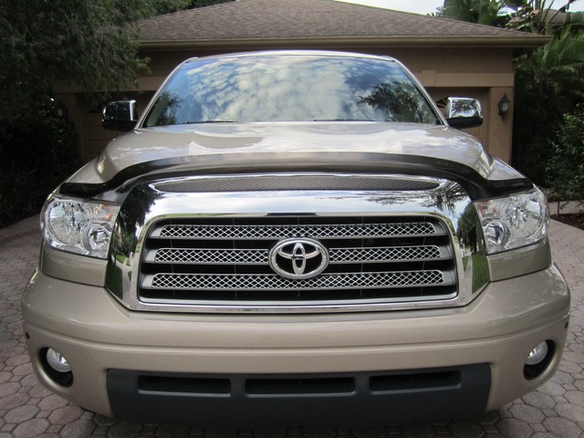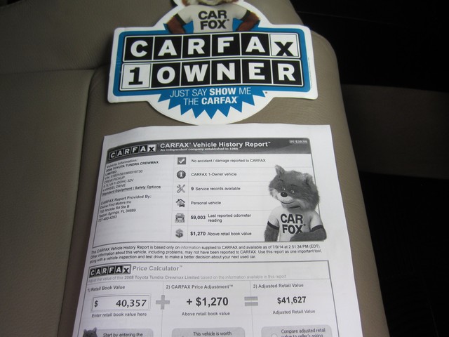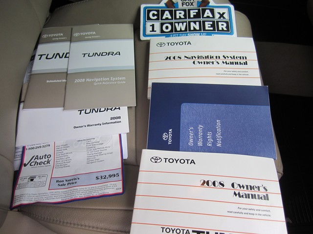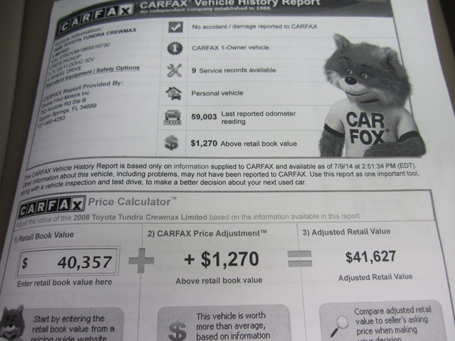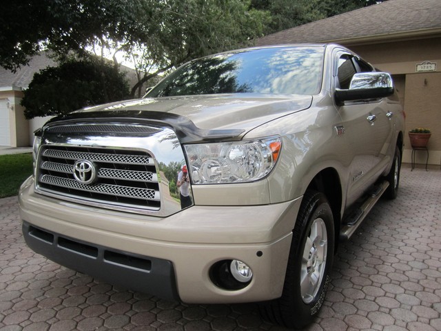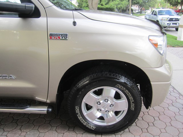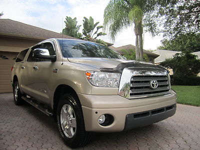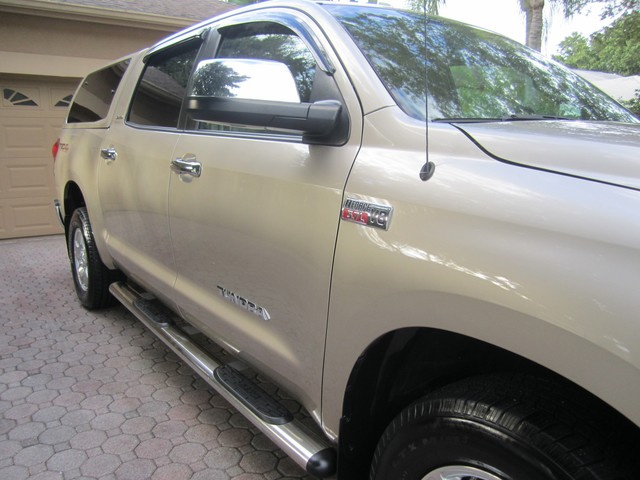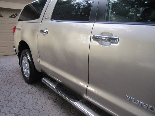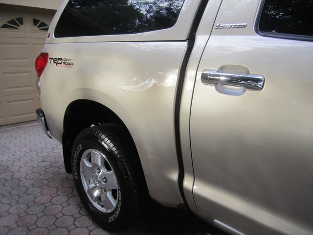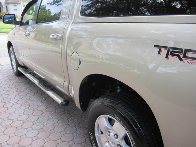 CONGRATULATION ON FINDING ONE OF THE CLEANEST, AND NICEST "2008 TOYOTA TUNDRA SUPER-CREW CAB 4DR LIMITED 4X4 TRD PACKAGE" ON THE PLANET...FOLKS THIS TRUCK IS LIKE BRAND NEW...THIS AMAZING TUNDRA HAS IT ALL, I DON'T THINK THERE IS ANYTHING THAT IT DOESN'T HAVE, IT IS LOADED WITH EVERYTHING YOU CAN GET ON ONE(THE BEST FULL-SIZE PICKUP TRUCK THAT MONEY CAN BUY) PERIOD, THERE IS NOT A BETTER ONE OUT THERE...NOT ONLY DOES IT HAVE EVERYTHING AND IT IS LIKE NEW INSIDE AND OUT,  IT IS A ONE ELDERLY FL. OWNER SINCE BRAND NEW...CLEAN CARFAX AND AUTOCHECK, NON-SMOKER, DOESN'T EVEN LOOK LIKE IT HAS EVER BEEN EATEN IN, OR I DON'T THINK IT HAS EVER BEEN CUSSED IN:)...YOU WILL GET THE BEST COLOR COMBINATION THERE IS, AND THE INTERIOR IS IN EXCELLENT CONDITION, AND IT IS PERFECT, I HAVE GREAT ADMIRATION FOR PEOPLE THAT TAKE SUCH GREAT CARE OF THEIR VEHICLES, VERY RARELY YOU WILL FIND ANYTHING THIS NICE, LOOKS LIKE THEY ONLY DROVE IT TO CHURCH ON SUNDAYS...THE EXTERIOR IS THE SAME WAY IT IS IN EXCELLENT CONDITION AS WELL, THERE IS HARDLY A MARK ON IT, NO DENTS, DINGS, SCRATCHES, IT LOOKS AND SHINES LIKE BRAND NEW...NAVIGATION, SATELITE RADIO, YOU WILL ALSO GET SOME ALMOST BRAND NEW "MICHELIN TIRES", THE VERY NICE 18" ALLOY WHEELS THAT ARE LIKE NEW ALSO...YOU WILL EVEN GET A MATCHING COLOR FIBERGLASS "LEER" CAMPER SHELL, ALL INSULATED, SLIDING WINDOWS WITH SCREENS, IT EVEN HAS A "BED CARPET" OVER THE BED-LINER...HAS ALL THE 4 ADJUSTABLE TIE-DOWNS AS WELL,...FOLKS THIS IS THE TRUCK YOU HAVE BEEN LOOKING FOR, YOU WILL LOVE IT...PLEASE WATCH THE VIDEO AT THE END OF THIS DESCRIPTION AND TAKE A LOOK AT ALL THE PICTURES I HAVE TAKEN, EVEN THE UNDERNEATH OF THIS TRUCK IS LIKE NEW, NEVER IN THE SALT OR SNOW OR MUD, IT DOESN'T EVEN LOOK LIKE IT HAS BEEN IN THE RAIN...TRULY A "DIVINE FIND" AND THE NEXT OWNER WILL BE VERY VERY HAPPY WITH IT...YOU WILL GET THE VERY NICE "ALL WEATHER TOYOTA TUNDRA RUBBER FLOOR MATS FRONT AND REAR, ALL THE BOOKS AND MANUALS, IT HAS THE VERY NICE RUNNING BOARDS, TOWING PACKAGE WITH THE FACTORY (TRANSMISSION & OIL COOLER) 6SPEED AUTOMATIC TRANSMISSION, TOWING MODE, CLASS 3 HITCH, AND WIRING HARNESS, YOU WILL ALSO GET THE BACK-UP CAMERA. MAY HAVE A FEW MORE MILES BY THE END OF THE AUCTION. PLEASE IF YOU HAVE ANY QUESTIONS PLEASE GIVE US A CALL JACK AT 727-460-4283 OR CAROL AT 727-798-7161 OR EMAIL US. THANK YOU GOD BLESS YOU AND HAVE A FANTASTIC DAY....