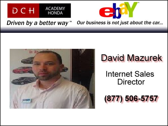 Hello ! My name is David Mazurek. I am an eBay sales specialist for DCH Academy Honda. I have well over over 12 years of experience. My philosophy has always been to provide excellent customer service and keep customers coming back! If you have any questions please feel free to contact me at any time!