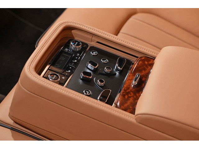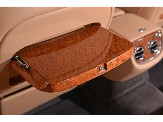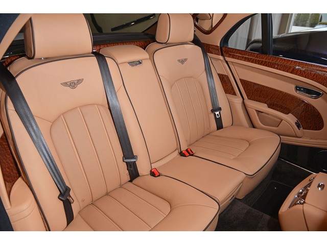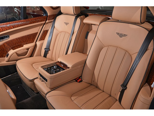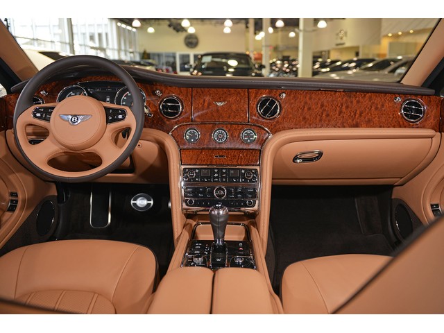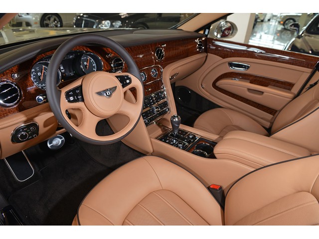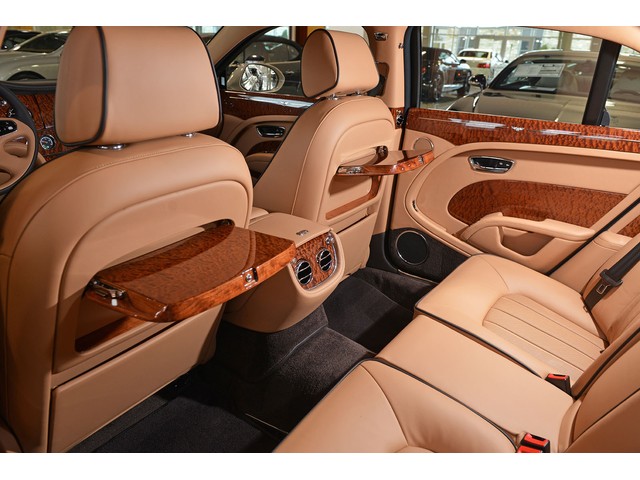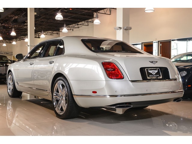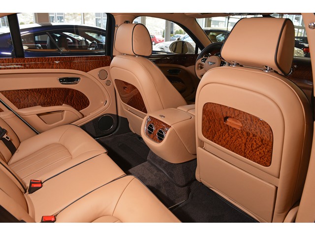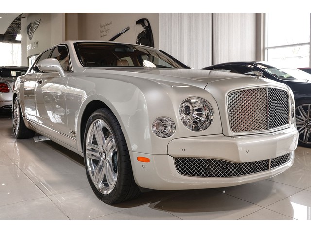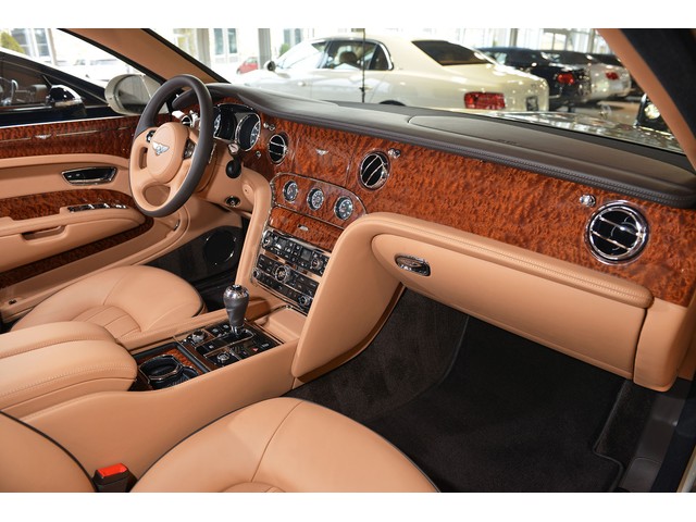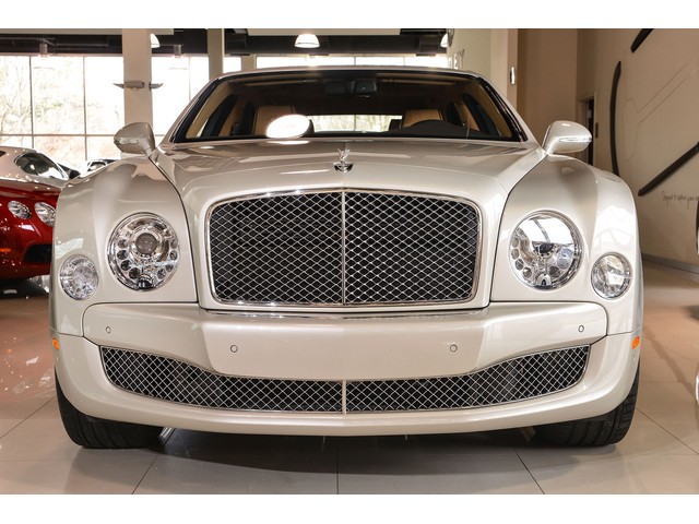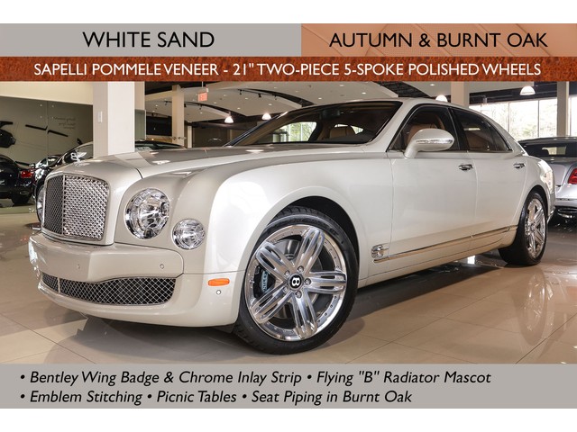 2014 Bentley Mulsanne in White Sand with Autumn hide interior, Burnt Oak secondary hide and Sapelli Pommele Veneer. Additional features include Seat Piping in Burnt Oak, Emblem Stitching in Burnt Oak, Bright Stainless Steel Matrix To Lower Bumper Apertures, Flying 'B' Radiator Mascot, Bentley Wing Badge & Chrome Inlay Strip To Waistrails & Badge To Fascia, Deep Pile Wilton Carpet Mats To Front And Rear, Seat Ventilation & Massage Function To Front & Rear Seats, Twin Illuminated Fold Down Vanity Mirrors and Rear Quarter Vanity Mirrors, Veneered Door Panels, Veneered Picnic Tables, Veneered iPod Drawer & Minor Gauges Panel, Ambient Interior Mood Lighting and 21" Two-Piece 5-Spoke Alloy Wheels - Polished. Original MSRP $340,855